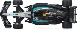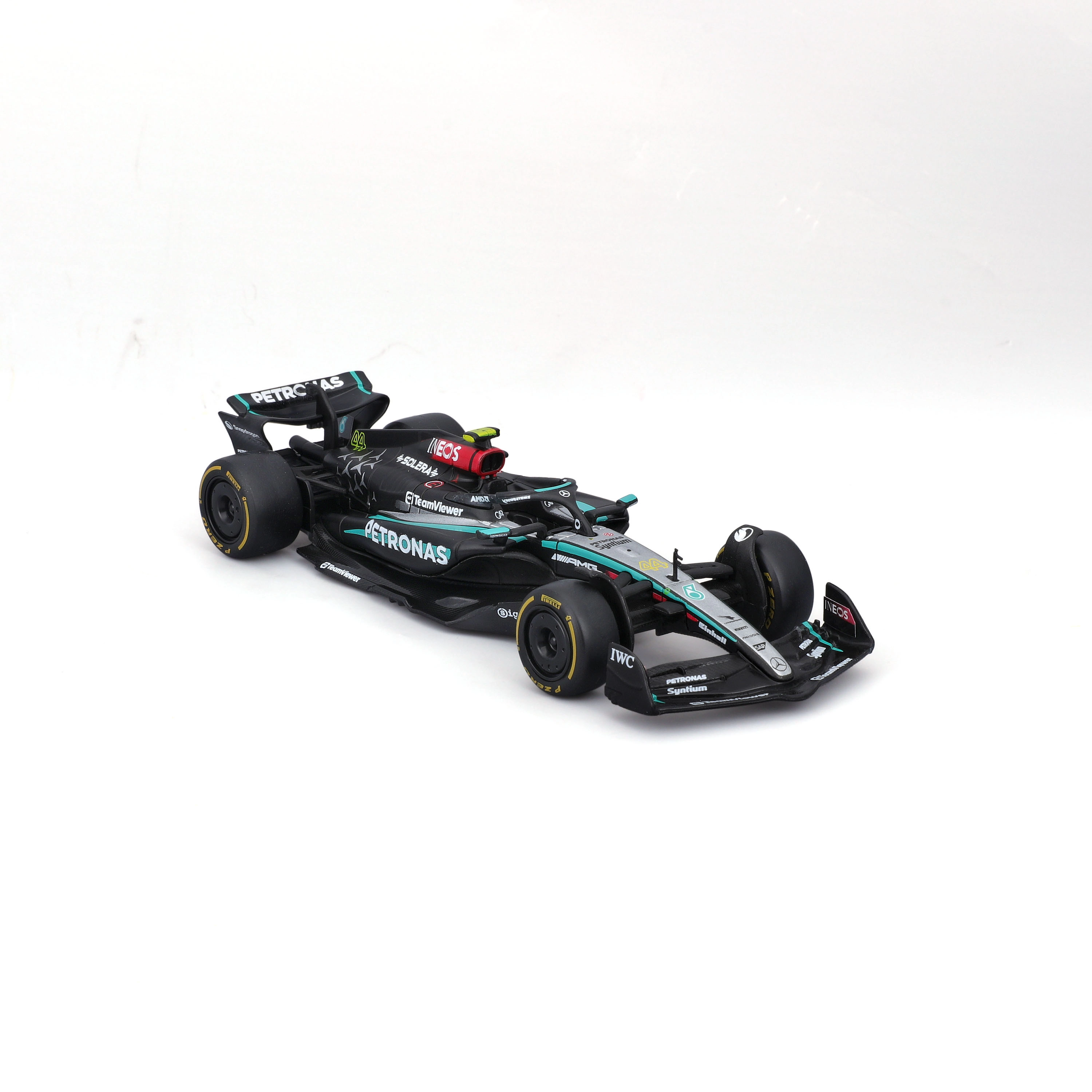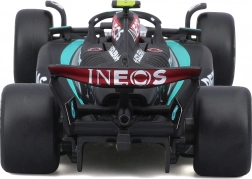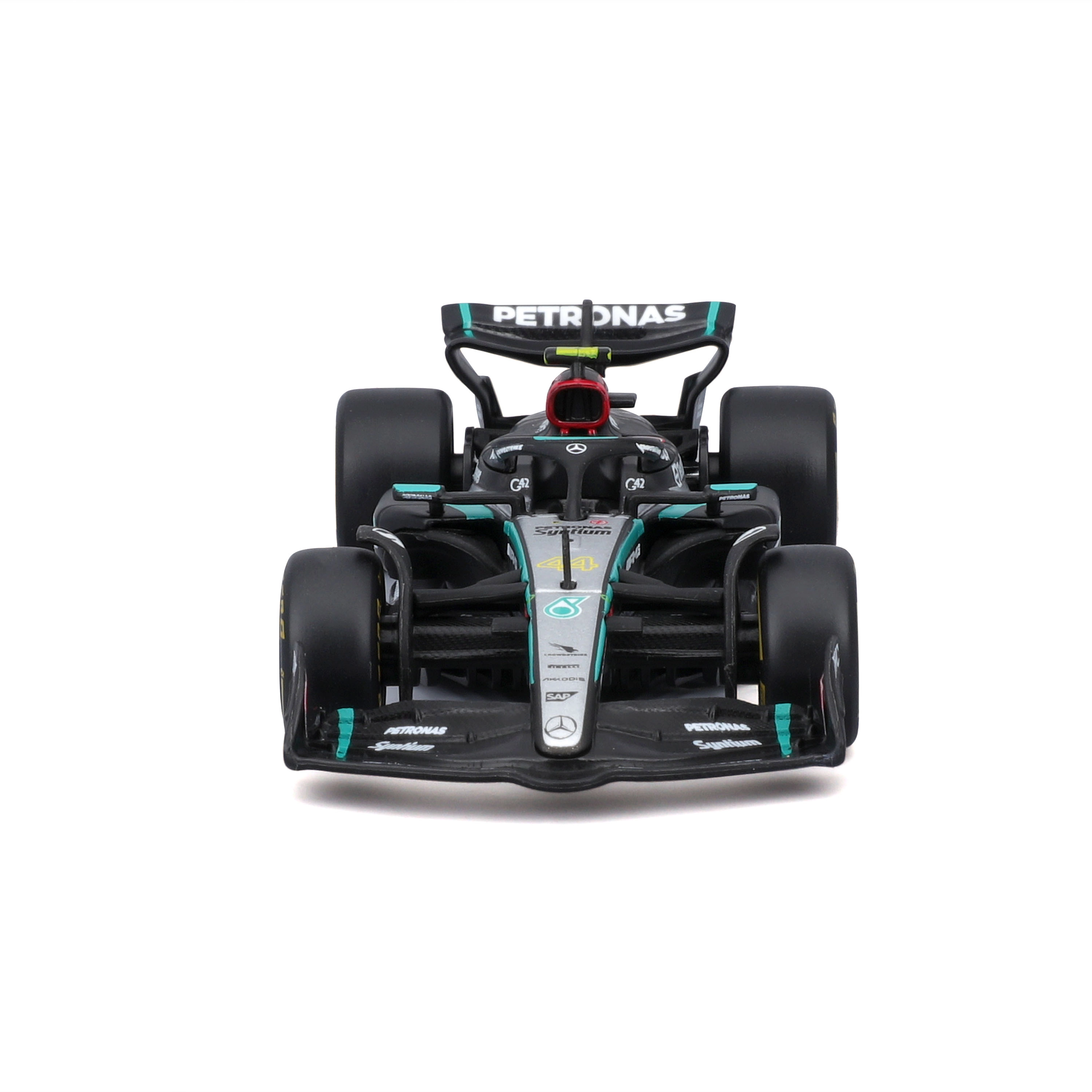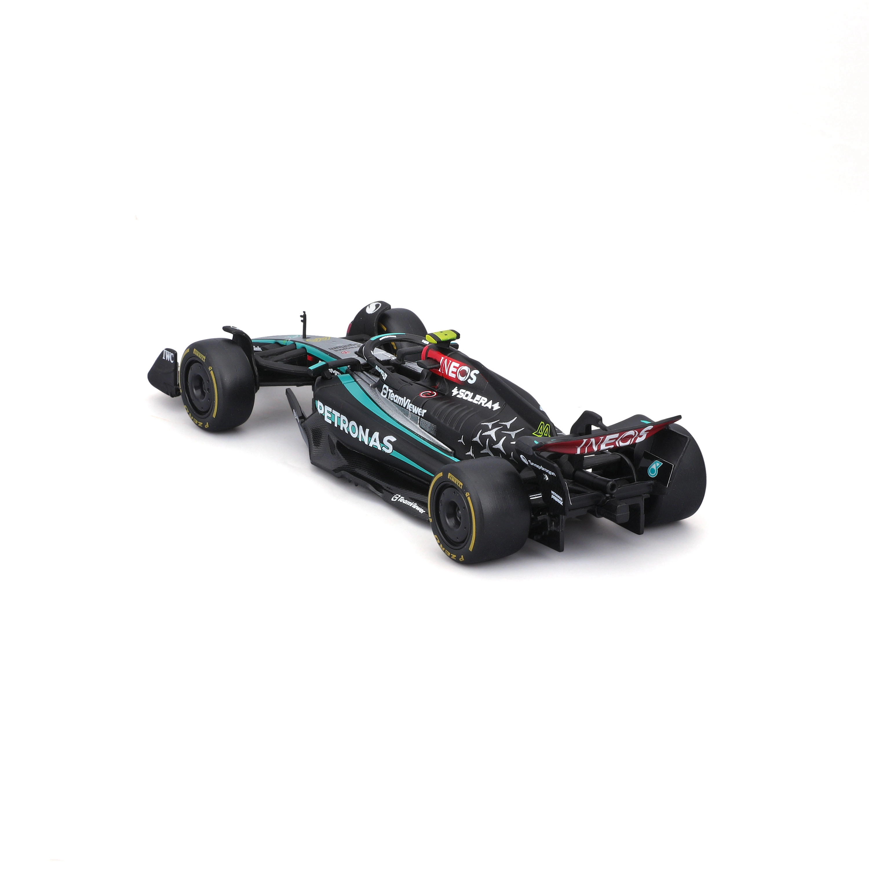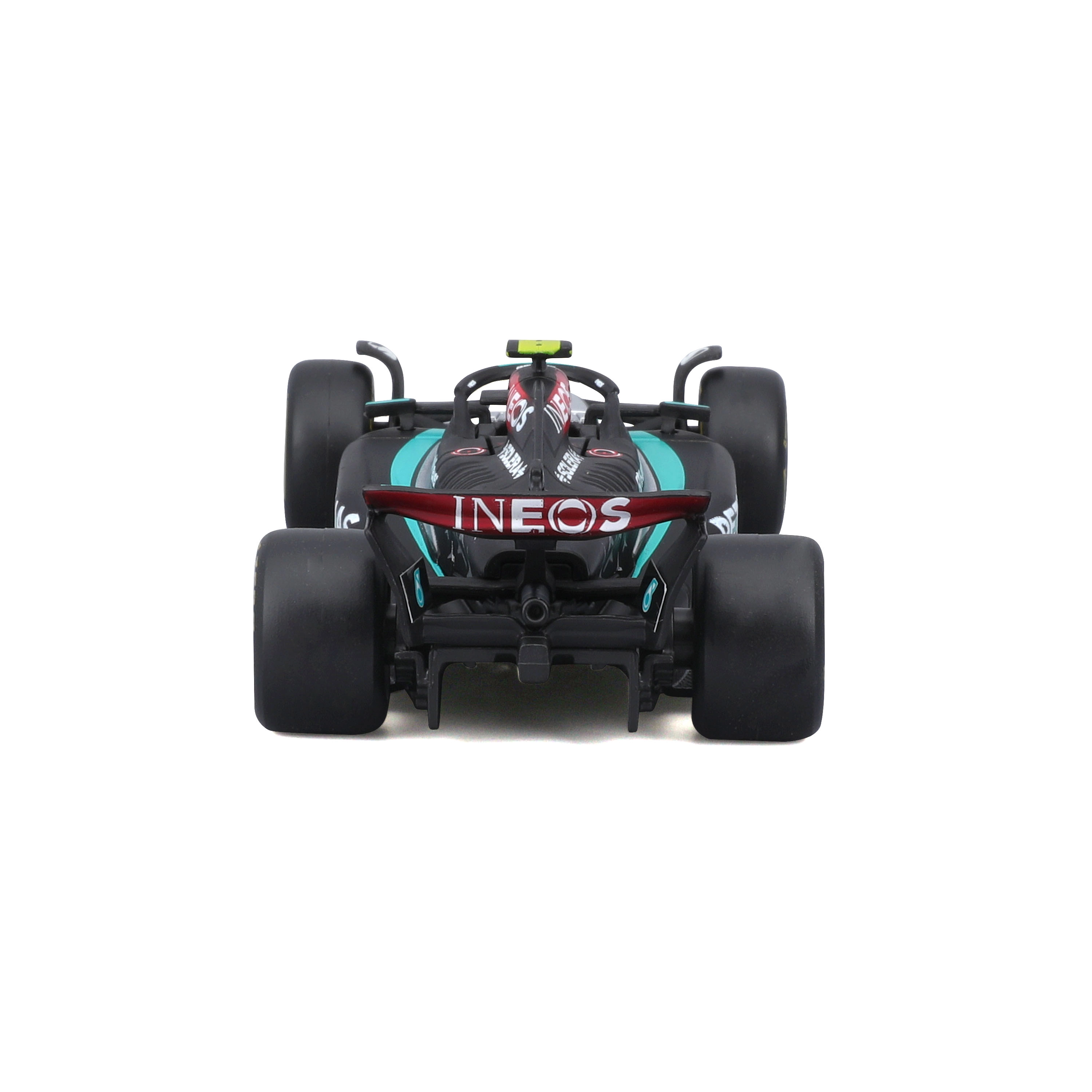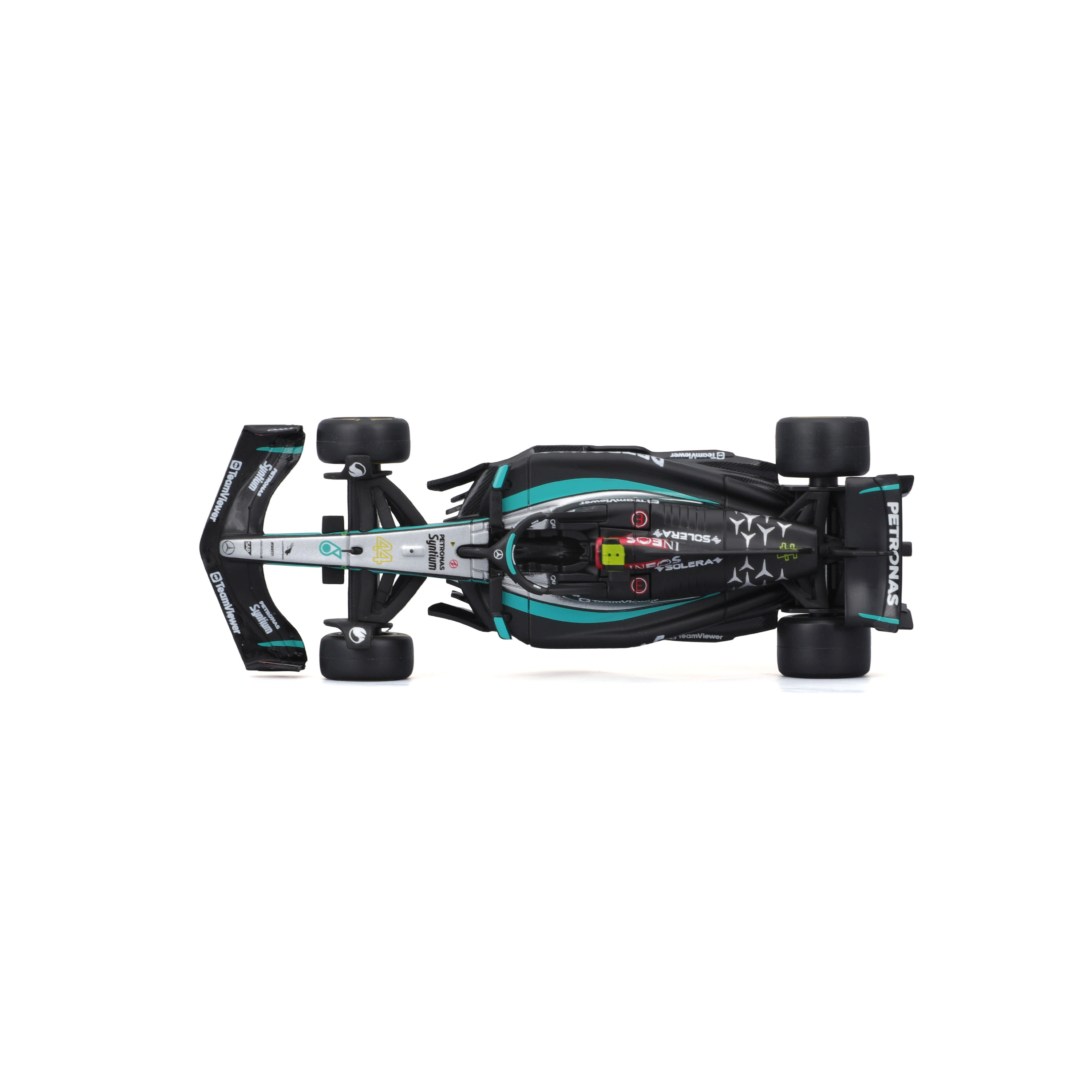 Precyzyjny nadruk sponsorów, dokładne odcienie czerni i turkusu oraz starannie ukształtowana aerodynamika czynią z modelu atrakcyjny egzemplarz kolekcjonerski.