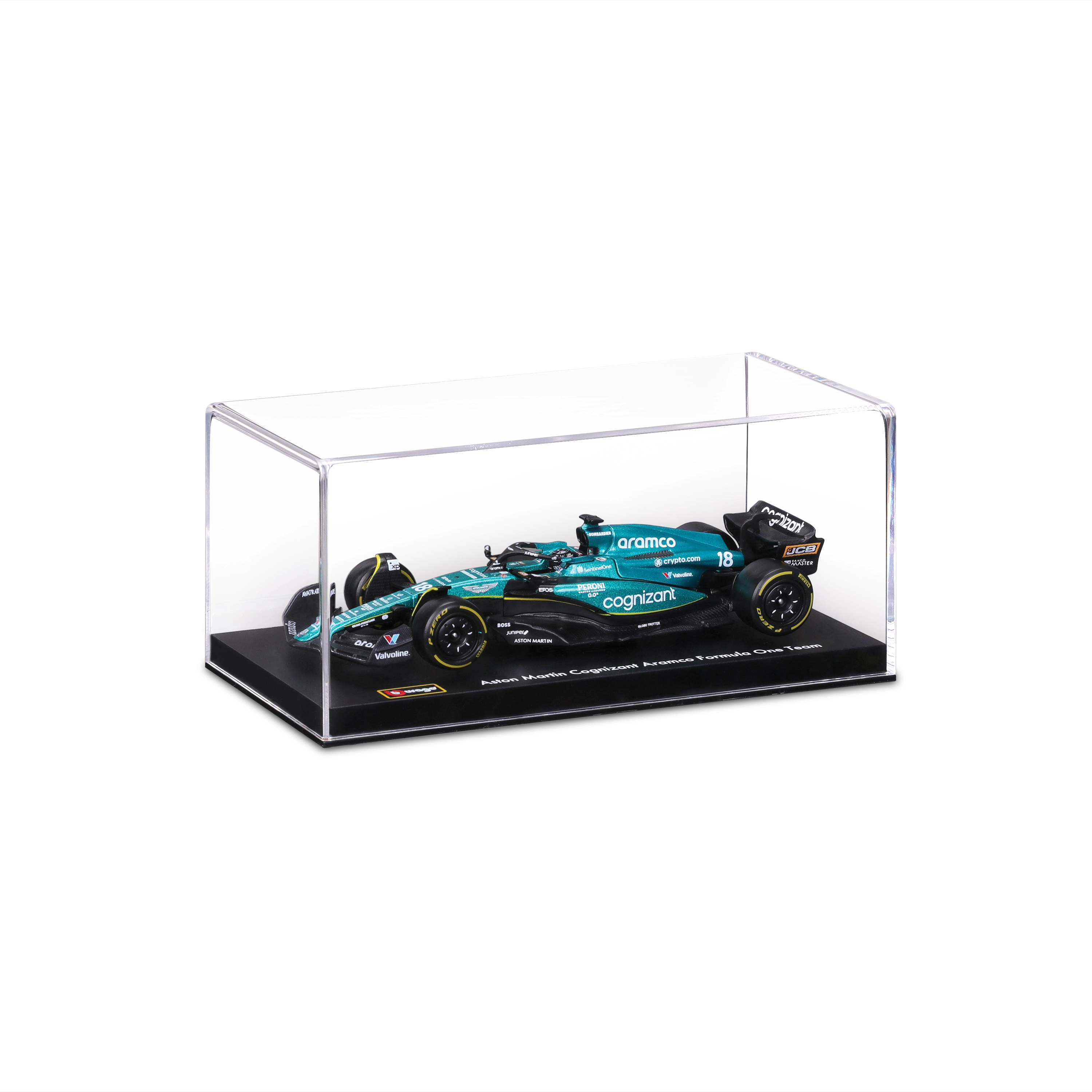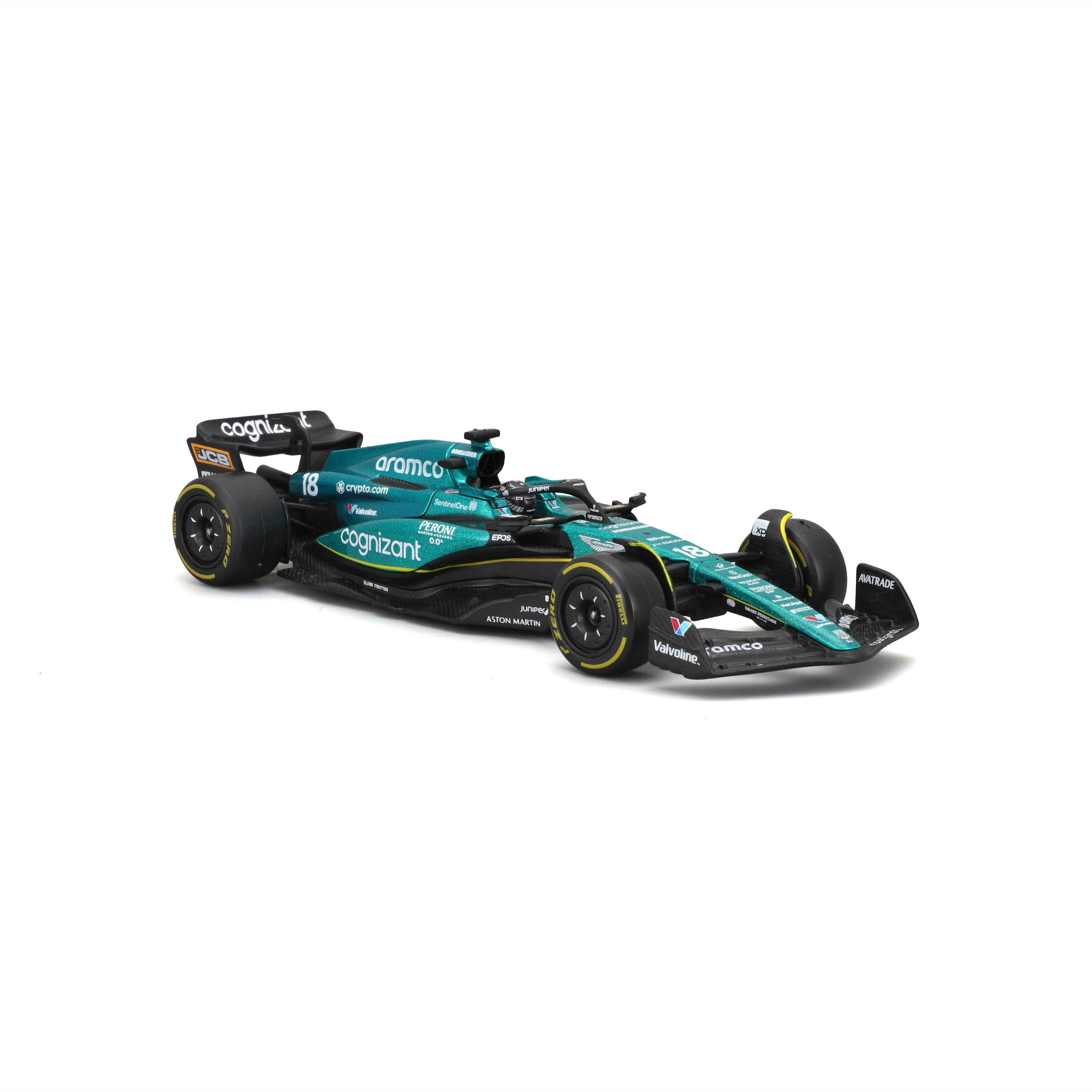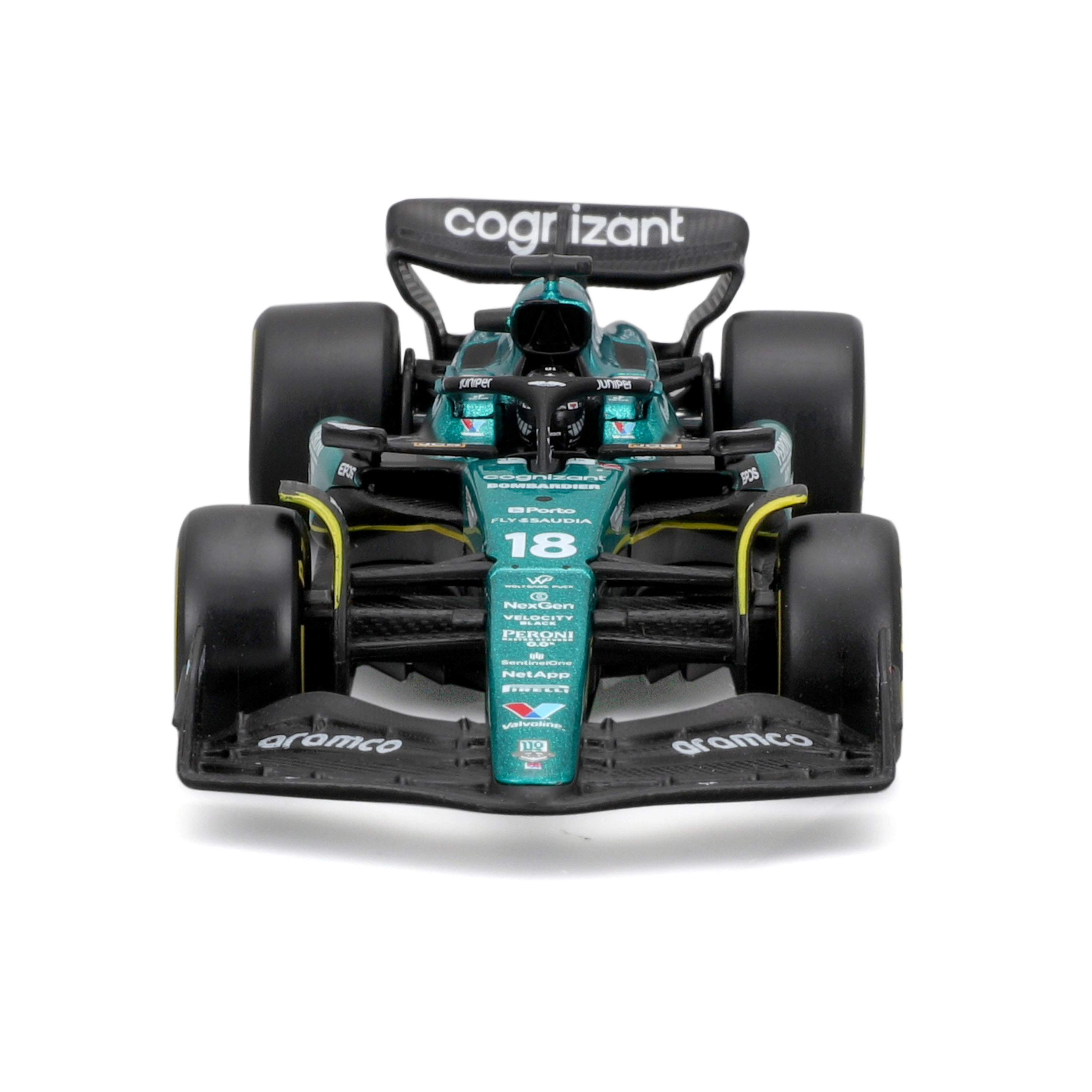Wierne barwy Aston Martin, logotypy sponsorów oraz precyzyjnie ukształtowane skrzydła, halo i dyfuzor dla maksymalnie autentycznego wyglądu.