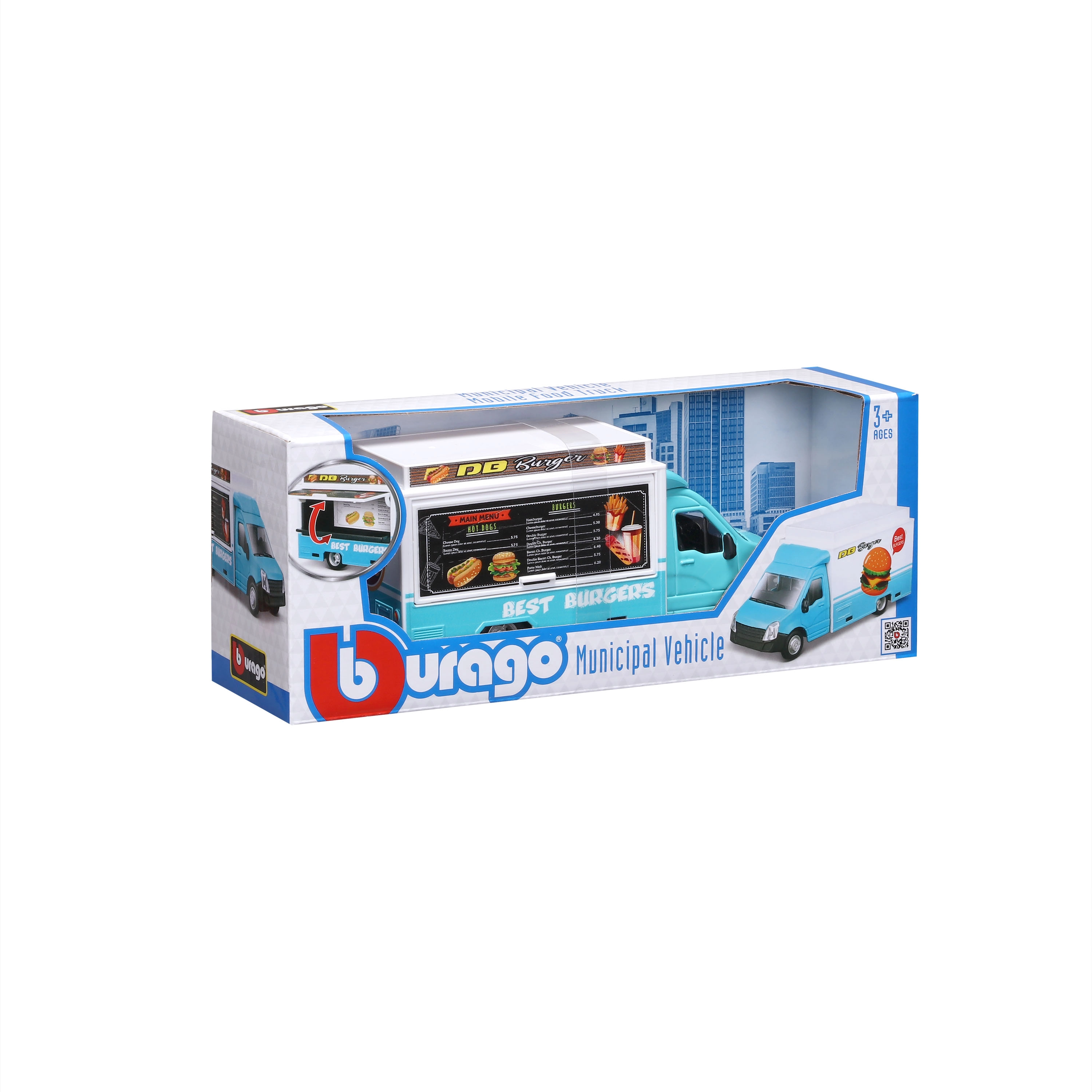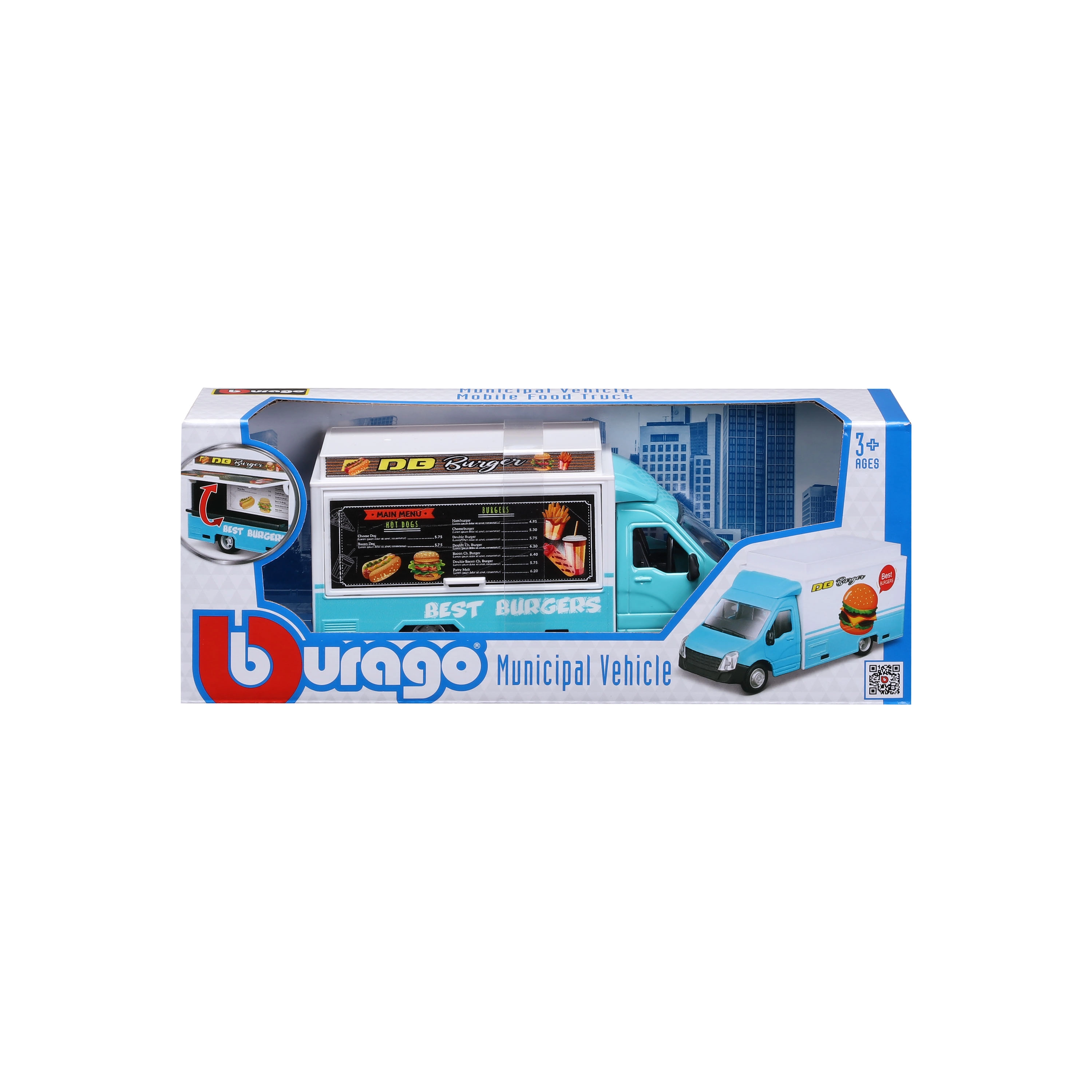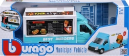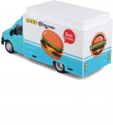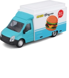 Odkryj urok miejskich usług dzięki szczegółowo opracowanemu modelowi burgerowego food trucka w skali 1:43. Połączenie turkusowej kabiny i białej nadbudówki z wyrazistą grafiką „Best Burgers” przyciąga uwagę od pierwszego spojrzenia. Dzięki kołom na wolnym biegu i płynnemu toczeniu pojazd jest gotowy zarówno do dynamicznej jazdy, jak i do ekspozycji na półce.