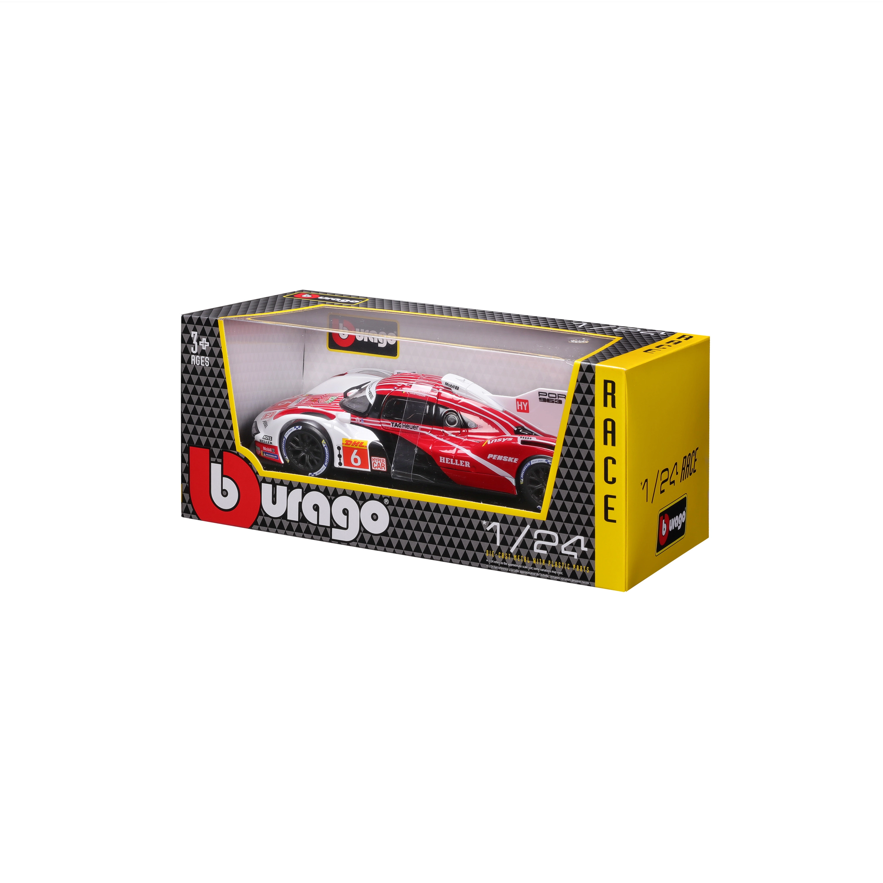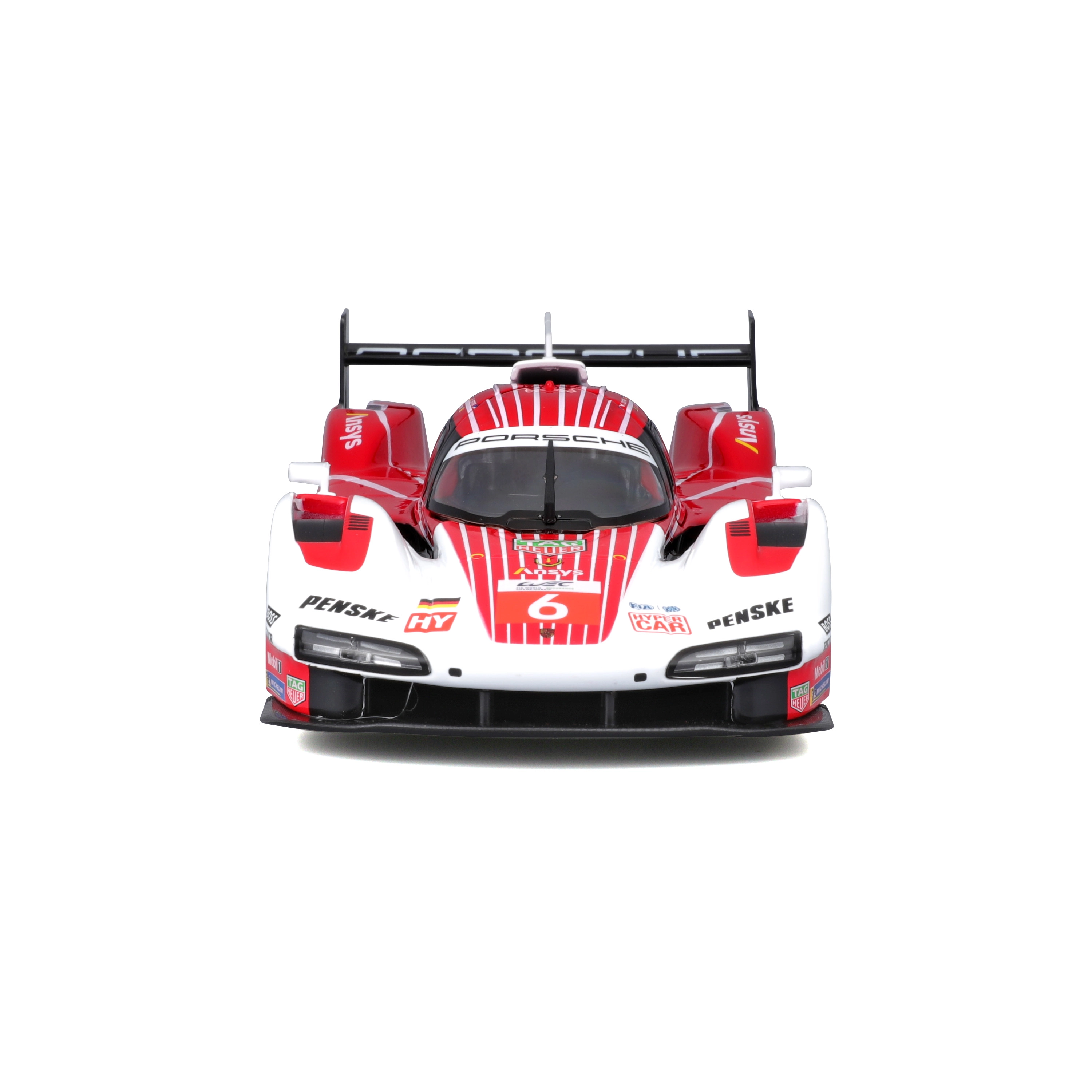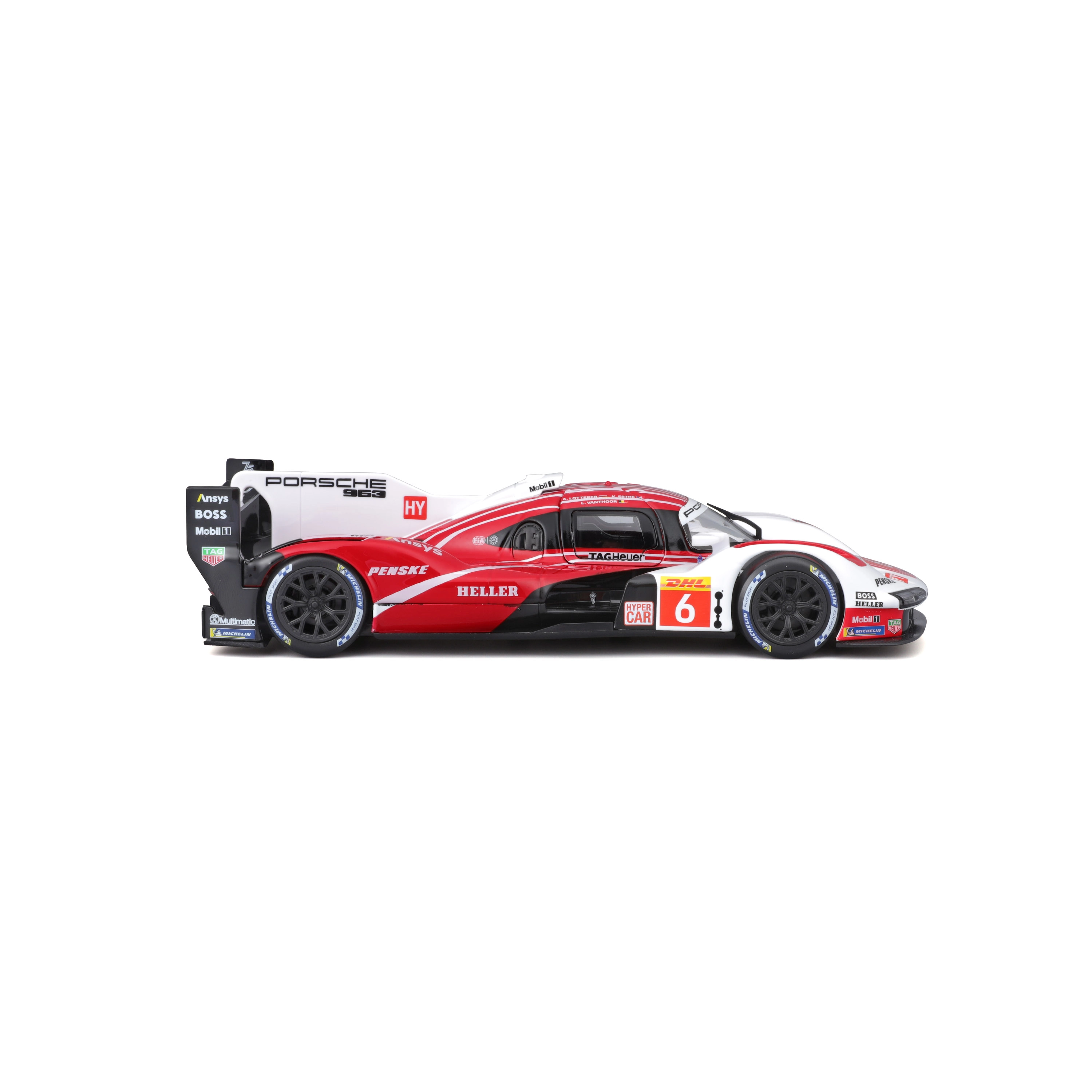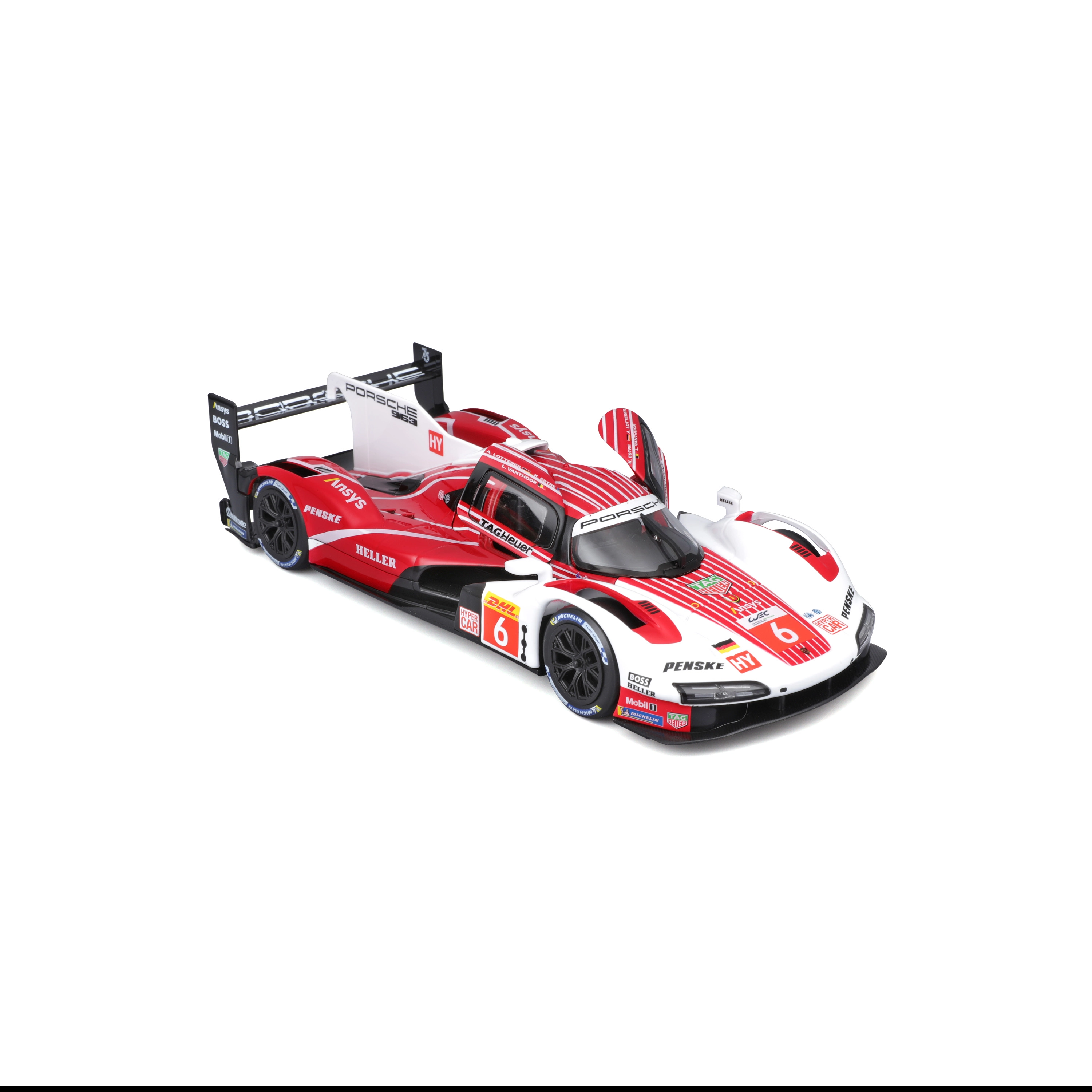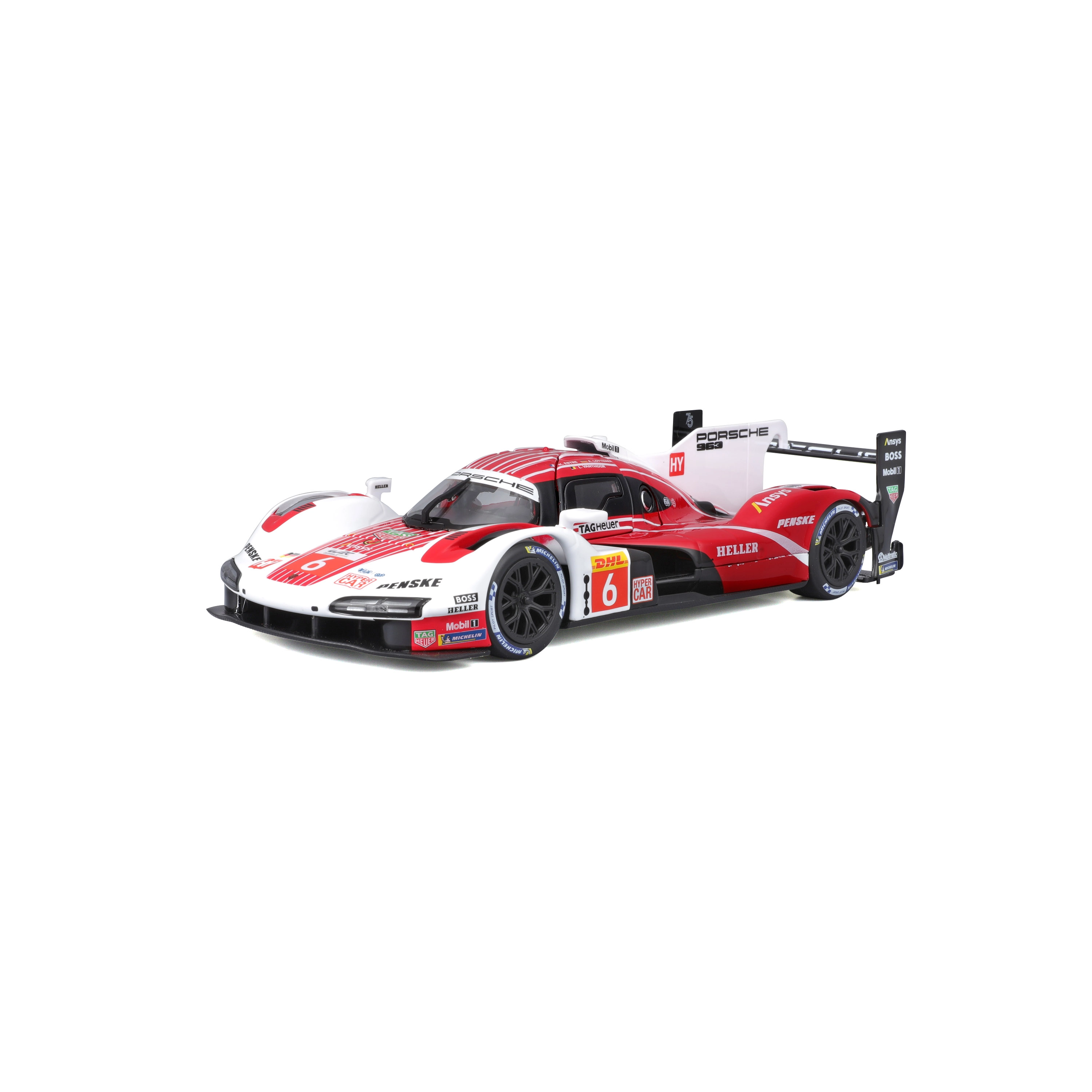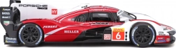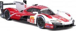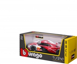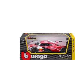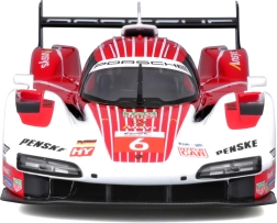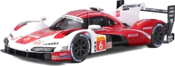 Model Bburago 1:24 wiernie oddaje charakter prototypu wytrzymałościowego PORSCHE 963 (2024) w czerwono-białym malowaniu wyścigowym z logotypami sponsorów. Metalowe nadwozie z plastikowymi dodatkami, precyzyjne linie oraz autentyczne elementy aerodynamiczne podkreślają kolekcjonerską wartość i wygląd ekspozycyjny.