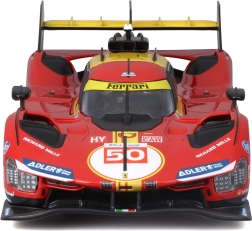 Wyścigowe naklejki, numer 50 i logotypy sponsorów podkreślają autentyczny wygląd modelu Ferrari 499P.