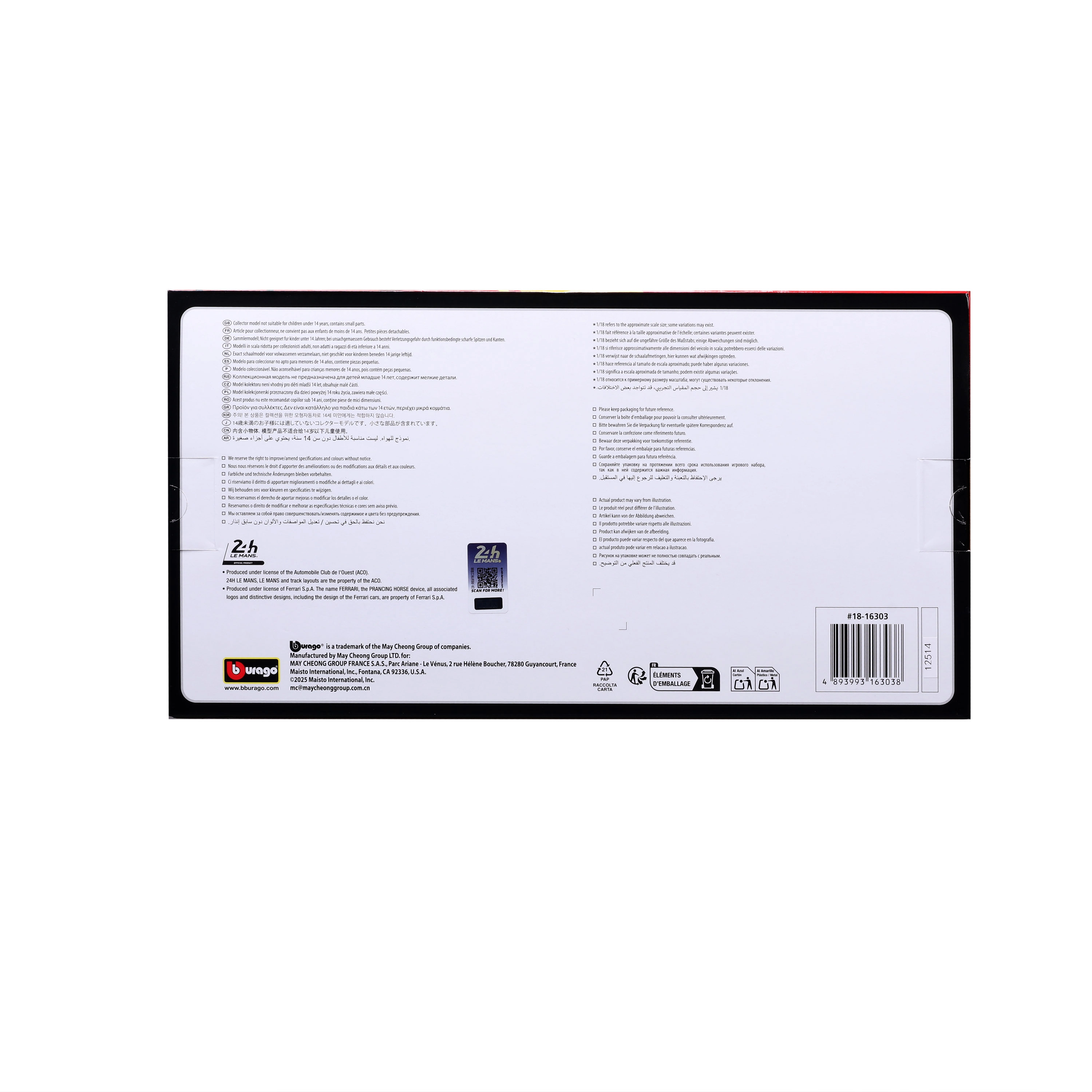 Prezentacja w oryginalnym pudełku Bburago z motywem 24H Le Mans ułatwia ekspozycję i wręczanie w prezencie.