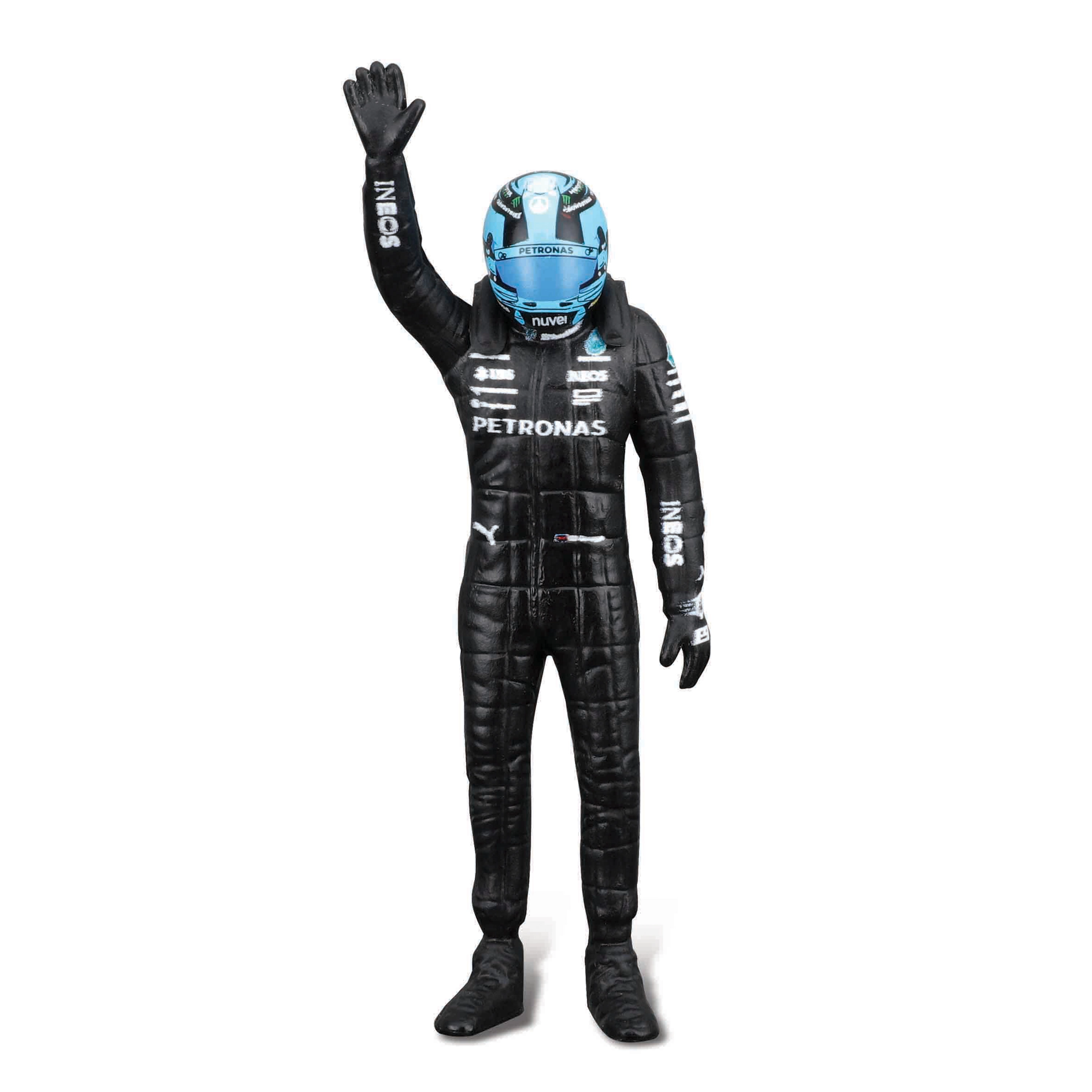 W zestawie znajduje się figurka kierowcy w teamowym kombinezonie z hełmem, idealna do stworzenia atrakcyjnej scenki w gablocie.
