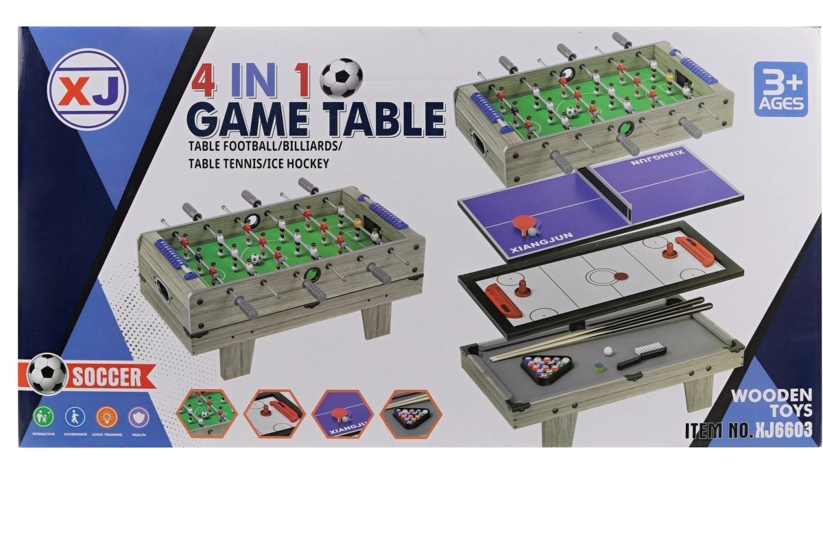 Ten multifunkcyjny zestaw oferuje cztery popularne gry stołowe w jednym kompaktowym komplecie. Duża drewniana podstawa zapewnia stabilność i długą żywotność, a wymienne plansze pozwalają szybko przełączać się między piłkarzykami, hokejem, ping‑pongiem i bilardem. Świetne rozwiązanie do domowej rozrywki bez potrzeby kupowania wielu oddzielnych gier.