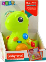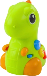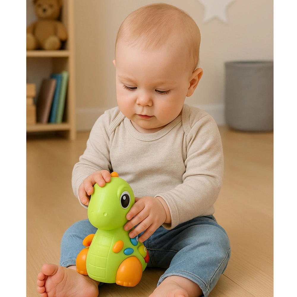 Interaktywny dinozaur przyciąga uwagę dzieci od pierwszego spojrzenia: po naciśnięciu kolorowych przycisków zapala się, odtwarza melodie i wydaje wesołe dźwięki. Delikatne stuknięcie w nos uruchamia muzykę i ruch, co wspiera zrozumienie związku między dotykiem a reakcją zabawki – świetna podstawa do nauki przez zabawę.