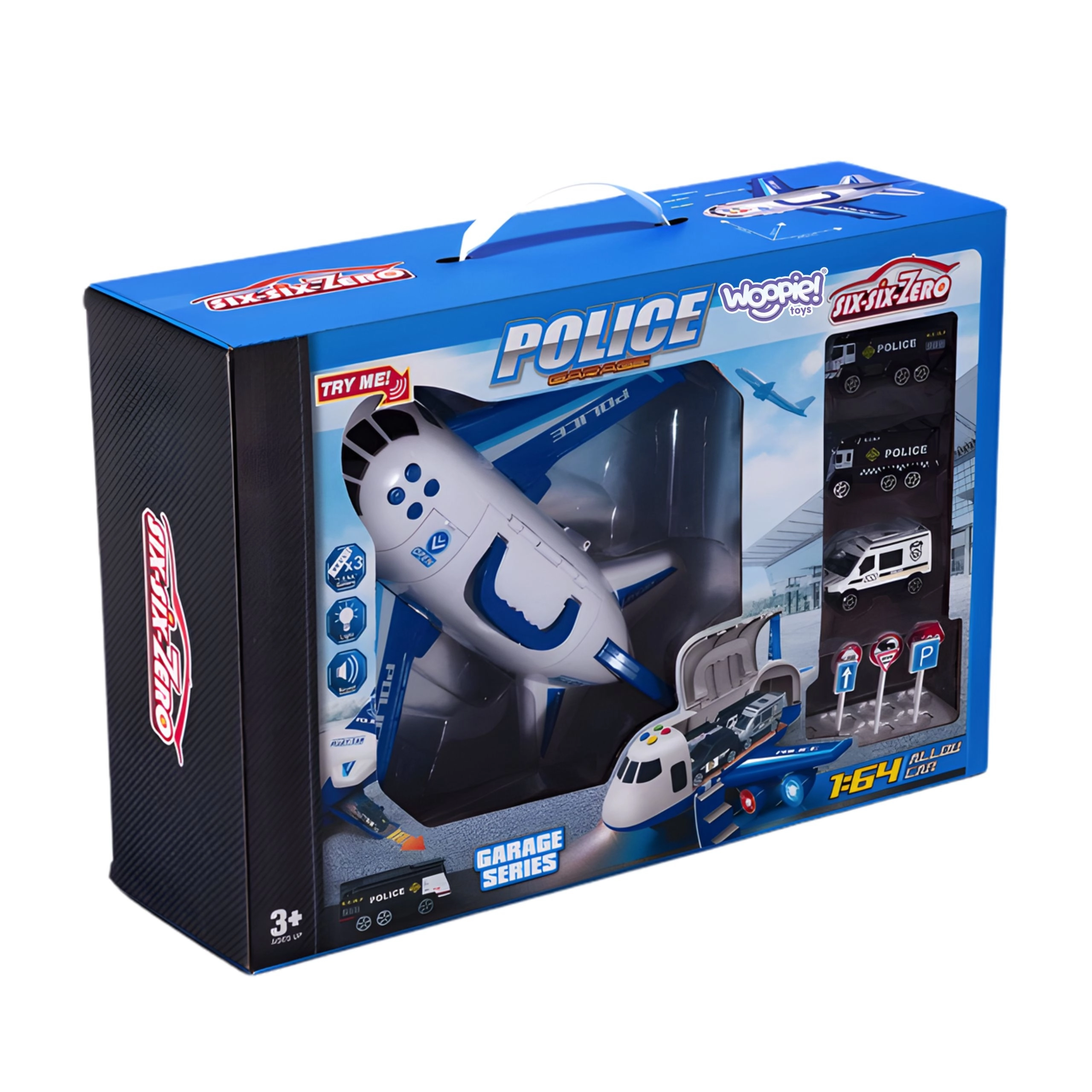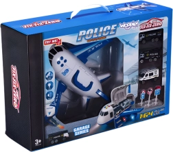 Odkryj duży policyjny samolot–transporter WOOPIE, który zabierze dziecięcą wyobraźnię na pełną akcji misję! Do przestronnego kadłuba mieszczą się 3 policyjne autka oraz zestaw znaków, nie brakuje efektów świetlnych i dźwiękowych z syrenami, otwieranego kadłuba i opuszczanej rampy ani praktycznego uchwytu do łatwego przenoszenia.