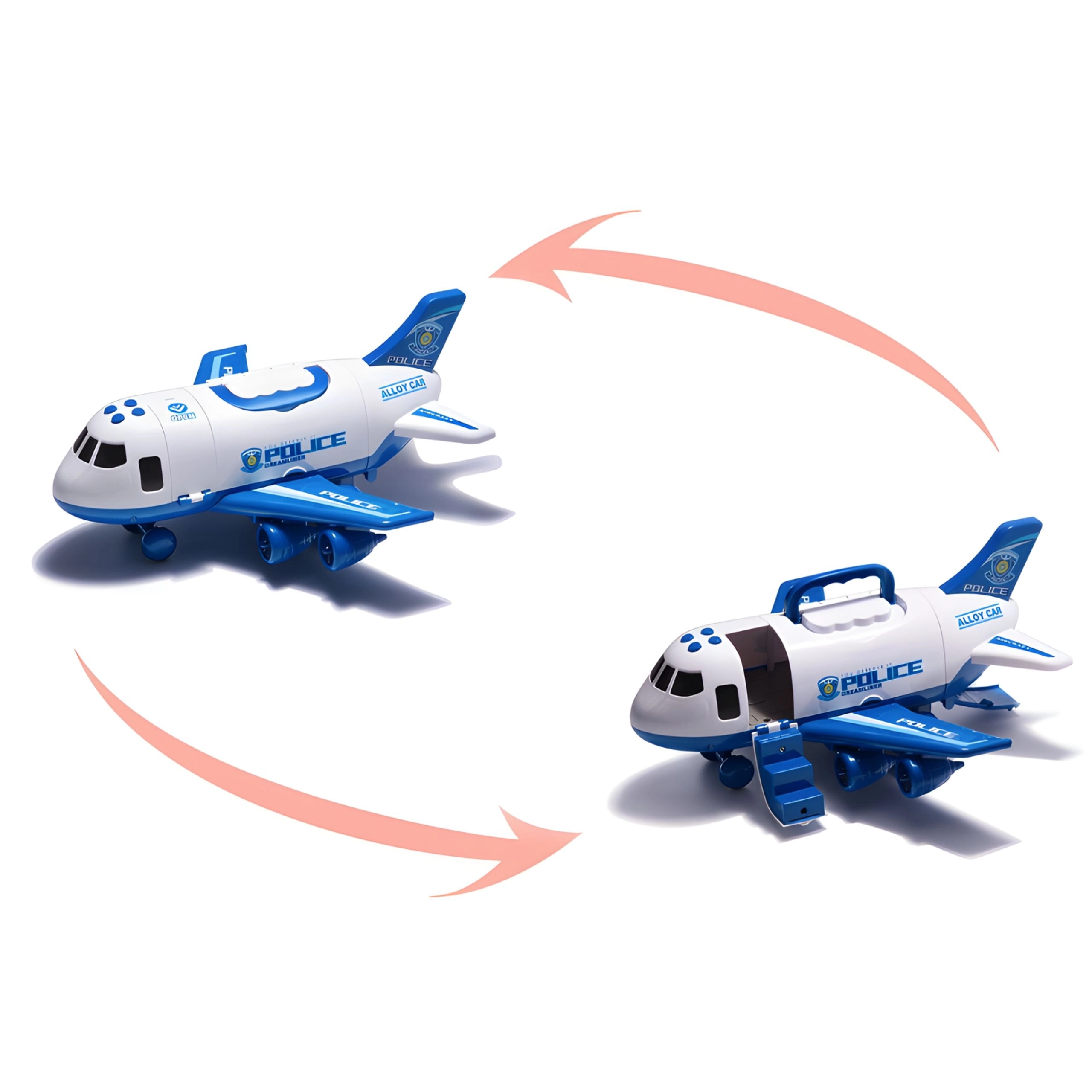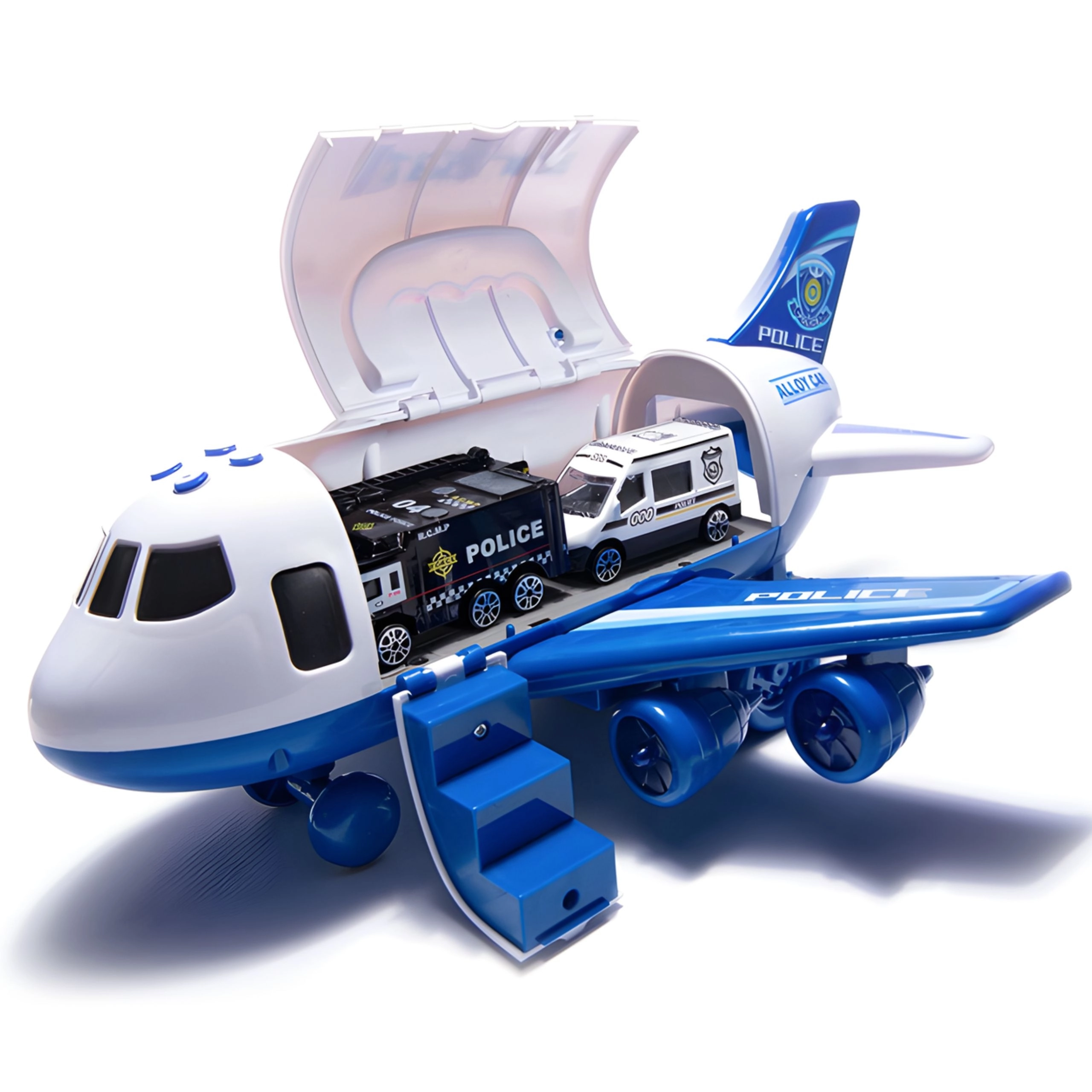 Samolot szeroko się otwiera, aby dzieci mogły wygodnie umieścić pojazdy w środku. Opuszczana rampa przyspiesza załadunek i wyładunek, wspierając realistyczną zabawę.