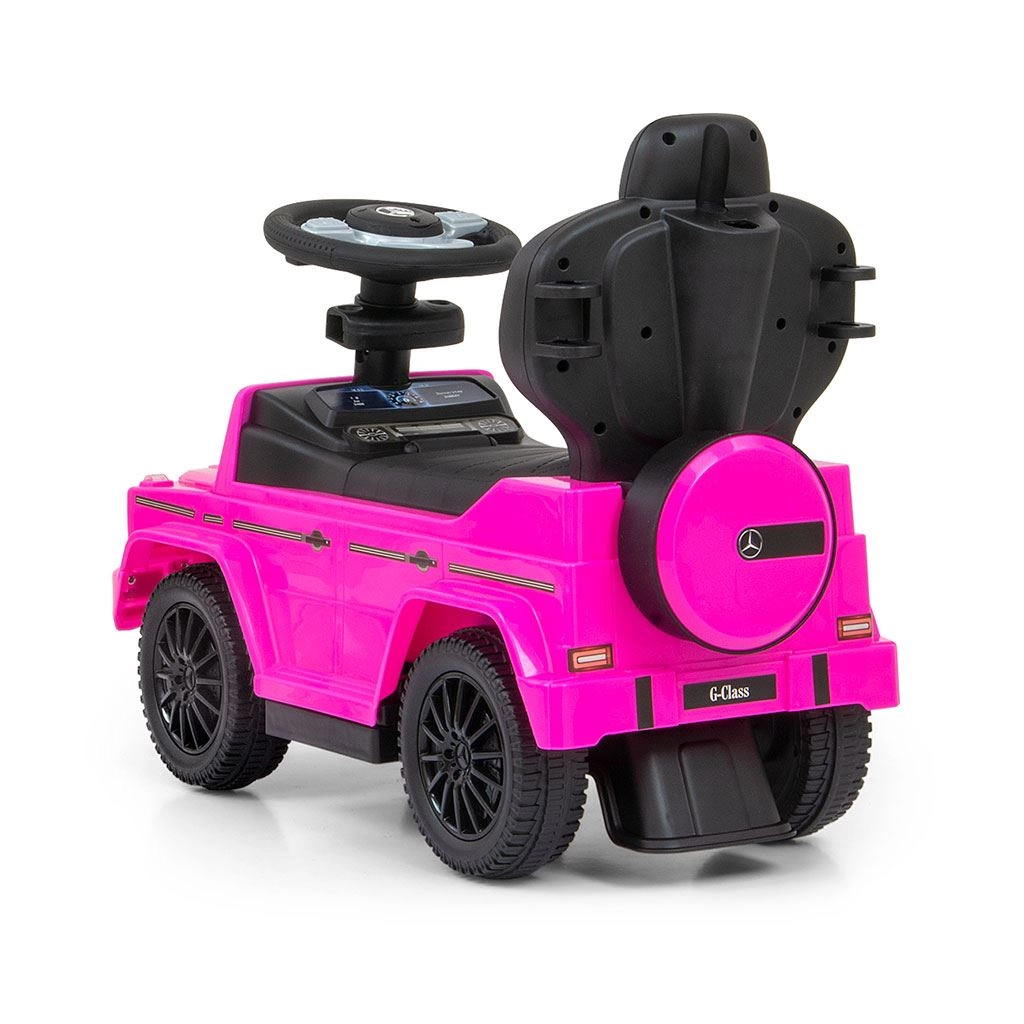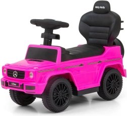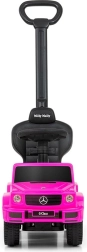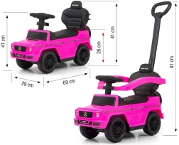Licencjonowany jeździk MERCEDES G350d w kolorze różowym wygląda jak prawdziwy samochód terenowy i zachęca dzieci do aktywności, trenuje równowagę i motorykę. Dzięki wysokiemu oparciu, bocznym podłokietnikom i drążkowi prowadzącemu nadaje się zarówno dla dzieci, które już potrafią siedzieć, jak i dla małych piechurów. Po demontażu drążka prowadzącego, podłokietników i podnóżków zmienia się w klasyczny jeździk.