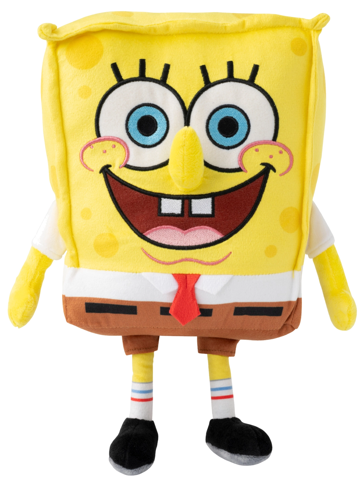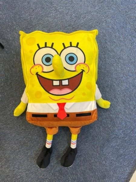 Ten duży pluszowy SpongeBob w intensywnie żółtym kolorze ma swój charakterystyczny szeroki uśmiech, niebieskie oczy, białą koszulę, czerwoną krawat i brązowe spodnie. Dzięki miękkiemu wypełnieniu i przyjemnej w dotyku powierzchni świetnie sprawdza się do codziennego przytulania i chwil relaksu.