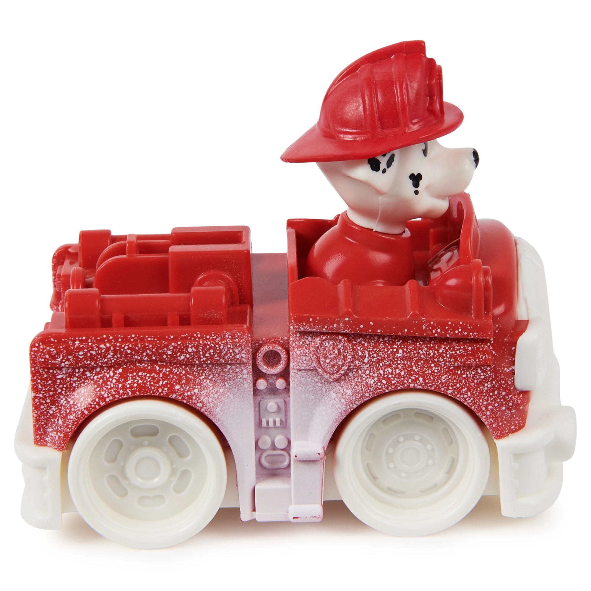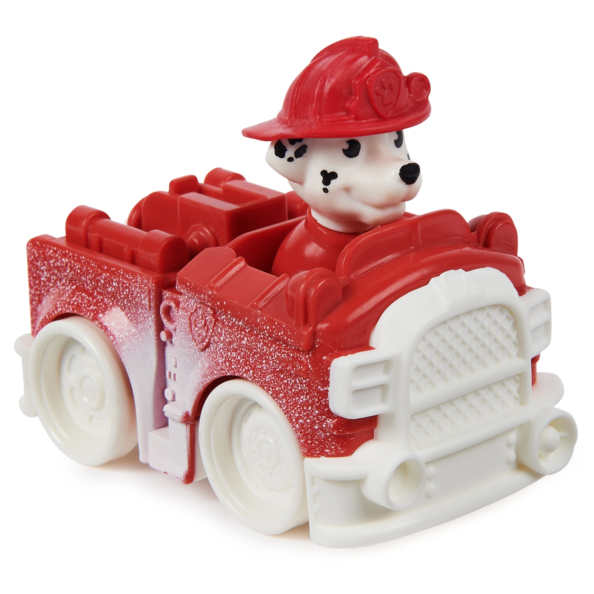 Białe „śnieżne” elementy na czerwonym wozie nadają zabawie zimowy klimat i podkreślają rolę Marshalla jako strażaka.