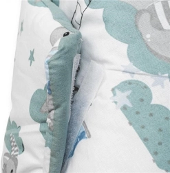 Praktyczny i stylowy rożek dla noworodków i niemowląt z uroczym motywem smoczków, chmurek i gwiazdek. Dzięki podwójnemu, dwustronnemu wzornictwu możesz używać go z obu stron – jednolita, kojąca zieleń lub radosny nadruk. Grubsze wypełnienie zapewnia optymalne podparcie i poczucie bezpieczeństwa.