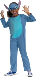 Niebieski kombinezon z jaśniejszym panelem na brzuchu oraz charakterystyczną maską wiernie odwzorowuje ulubioną postać z Lilo & Stitch.