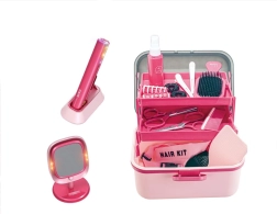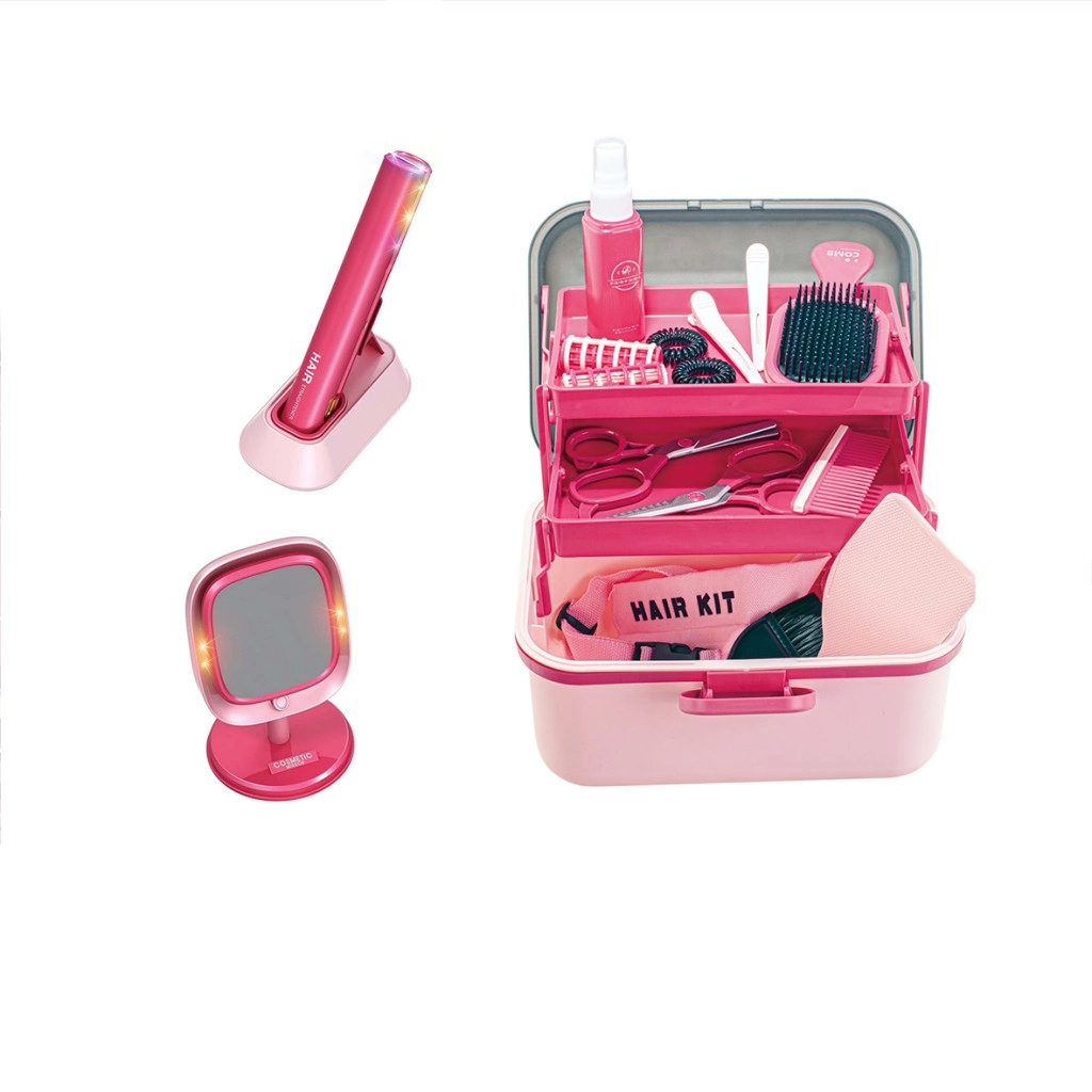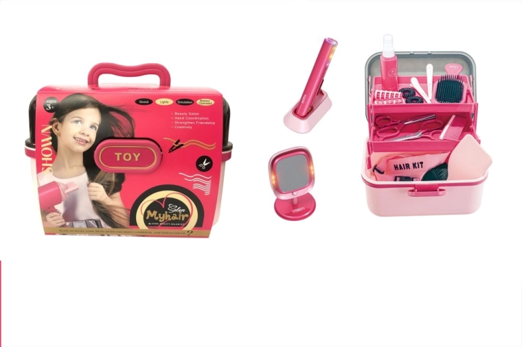 - Dziecięca prostownica do włosów, stojak ładujący, lustro stołowe z efektami świetlnymi, walizeczka z przegródkami, grzebienie, szczotki, nożyczki, spinki, spray (zabawka)