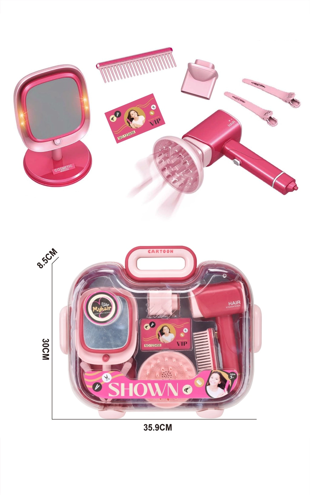 Studio fryzjerskie dla dzieci z lustrem i suszarką to zabawny i bogato wyposażony zestaw dla małych elegantów. Realistyczna różowa suszarka z dyfuzorem oferuje efekty świetlne i dźwiękowe, dzięki czemu działa jak prawdziwe urządzenie fryzjerskie. W zestawie znajduje się również stojące lustro z bocznym oświetleniem na stabilnej podstawie, utrzymane w różowo‑fioletowych tonach.