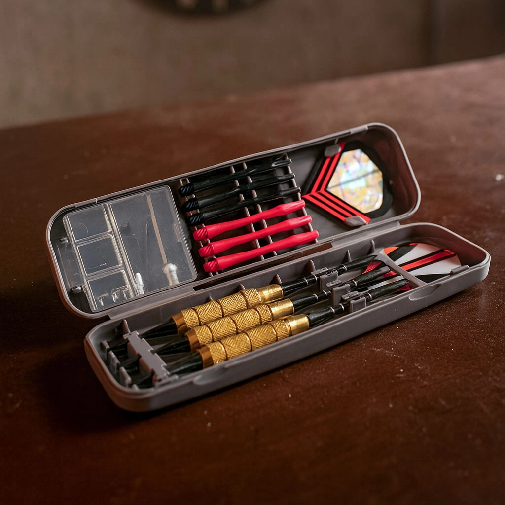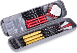 Kompletny zestaw rzutek do domowej zabawy i treningu. Zawiera 3 gotowe mosiężne rzutki 17 g, zapasowe groty, trzonki i lotki oraz praktyczne etui. Radełkowane (knurled) uchwyty zapewniają pewny chwyt i precyzyjną trajektorię lotu na klasyczne tarcze sizalowe.