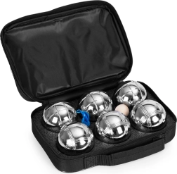 Zestaw zawiera 6 wytrzymałych kul z chromowanej stali o średnicy 72 mm i masie ok. 700 g dla wygodnego i stabilnego rzutu. Dwa różne wzory rowkowania ułatwiają rozróżnienie kul podczas gry. Drewniany cochonnet służy jako cel, a sznurek pomiarowy pomaga sprawiedliwie rozstrzygać sporne sytuacje.