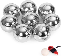 Zestaw zawiera 8 chromowanych stalowych kul z różnymi liniowymi wzorami dla łatwego rozróżnienia graczy. Każda kula ma średnicę 72 mm i wagę około 700 g, co zapewnia pewny chwyt i stabilny rzut. W komplecie drewniany jack oraz miarka sznurkowa do precyzyjnego ustalenia, która kula jest najbliżej – uczciwa gra bez sporów.