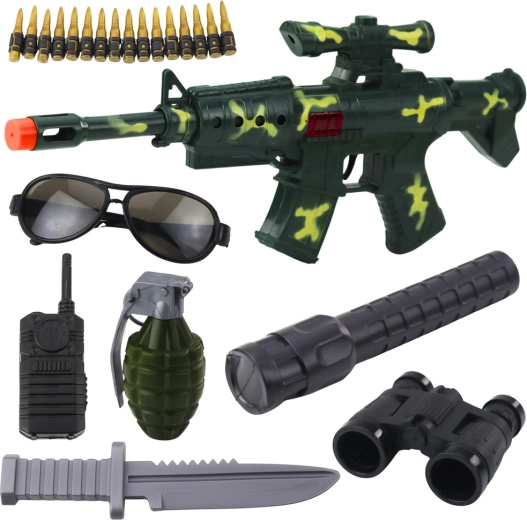 Zestaw obejmuje granat, nóż, lornetkę, latarkę, krótkofalówkę, gogle i pas z nabojami – wszystko do realistycznych scenariuszy i rozwoju wyobraźni.