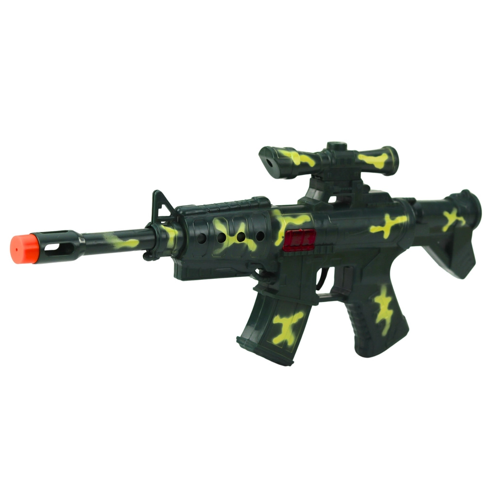 Po naciśnięciu spustu rozlega się wyraźny mechaniczny efekt strzału, który potęguje klimat zabawy. Plastikowa konstrukcja z detalami moro jest lekka i bezpieczna dla dzieci.