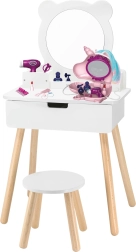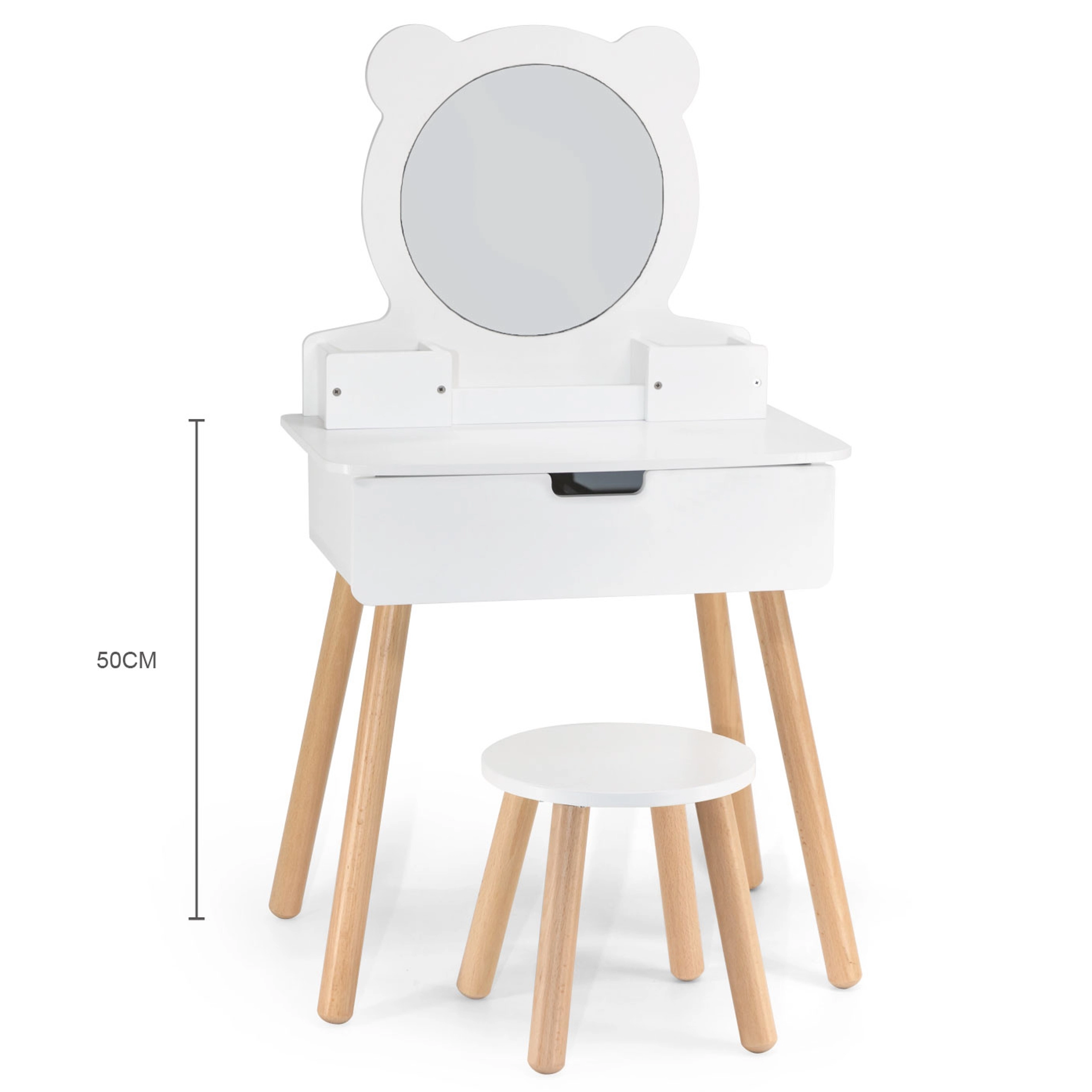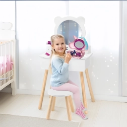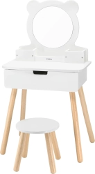 Solidna drewniana konstrukcja, okrągłe lustro z „misiowymi uszkami”, praktyczna szuflada i przegródki utrzymają wszystkie akcesoria na swoim miejscu.