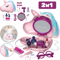 Zestaw zawiera również torbę jednorożca z bogatym wyposażeniem do zabawy w fryzjera i salon kosmetyczny. Dzieci mogą poćwiczyć malowanie, czesanie i suszenie – zabawkowa suszarka dmucha powietrzem – oraz stylizować „grzywę” jednorożca. Ta zabawa wspiera kreatywność, małą motorykę, wyobraźnię i koordynację.