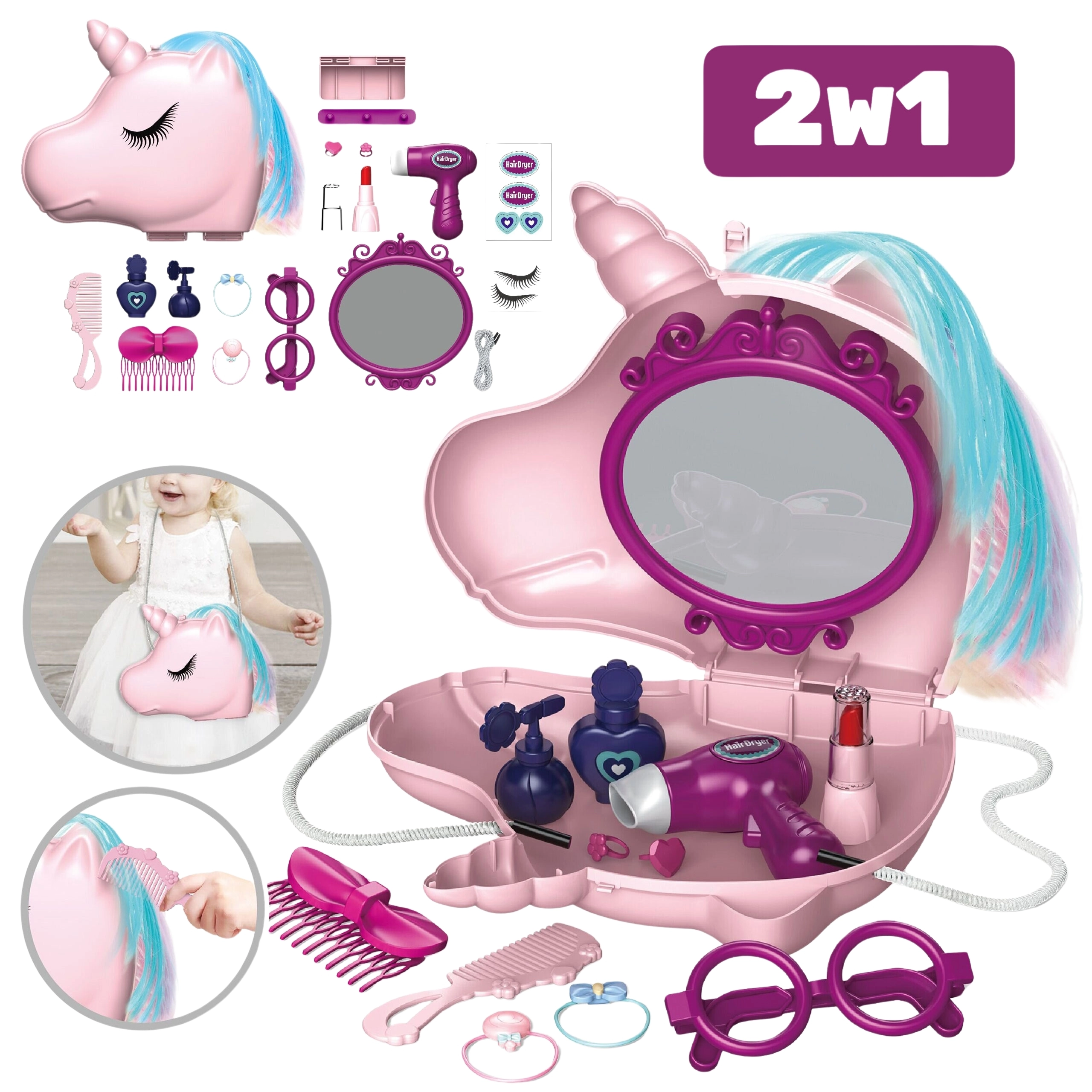 W zestawie torba jednorożca z 19 elementami akcesoriów: suszarka dmuchająca powietrzem, lusterko, grzebienie, spinki, „perfumy”, pomadka i inne.