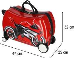Zabawny i praktyczny towarzysz podróży: ta dziecięca walizka z motywem motocykla łączy funkcję jeździka i bagażu podręcznego. Dzięki czterem cichym kółkom, lekkiej konstrukcji i odpinanemu paskowi na ramię dzieciom łatwo ją prowadzić, ciągnąć i nosić. Wytrzymała skorupa ABS+PC chroni rzeczy w podróży, a pojemność 30 l mieści wszystko, co potrzebne.