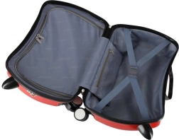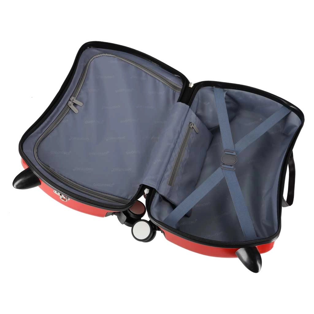 Dziecko może usiąść na walizce i dać się ciągnąć. Przednie „rogi” służą jako bezpieczne uchwyty, a dwupoziomowe kółka gwarantują stabilność i łatwe manewrowanie.