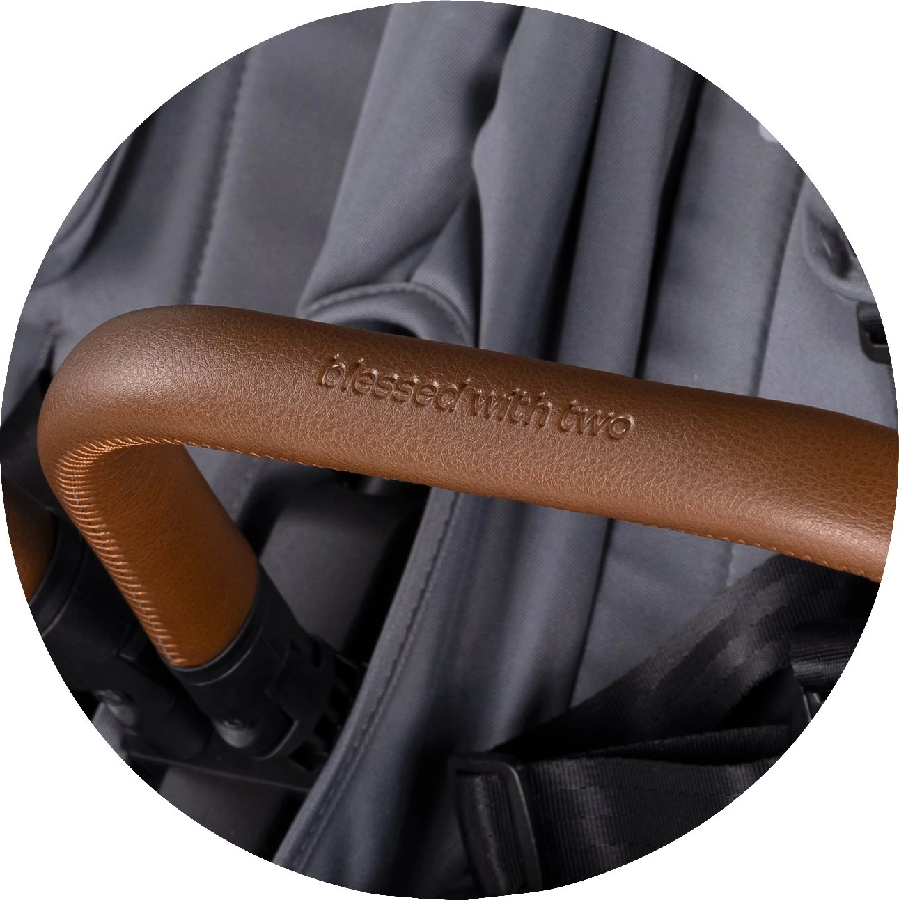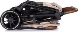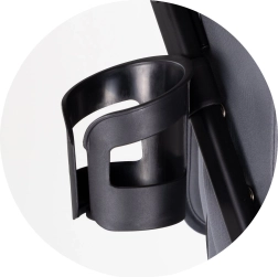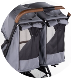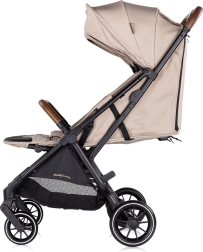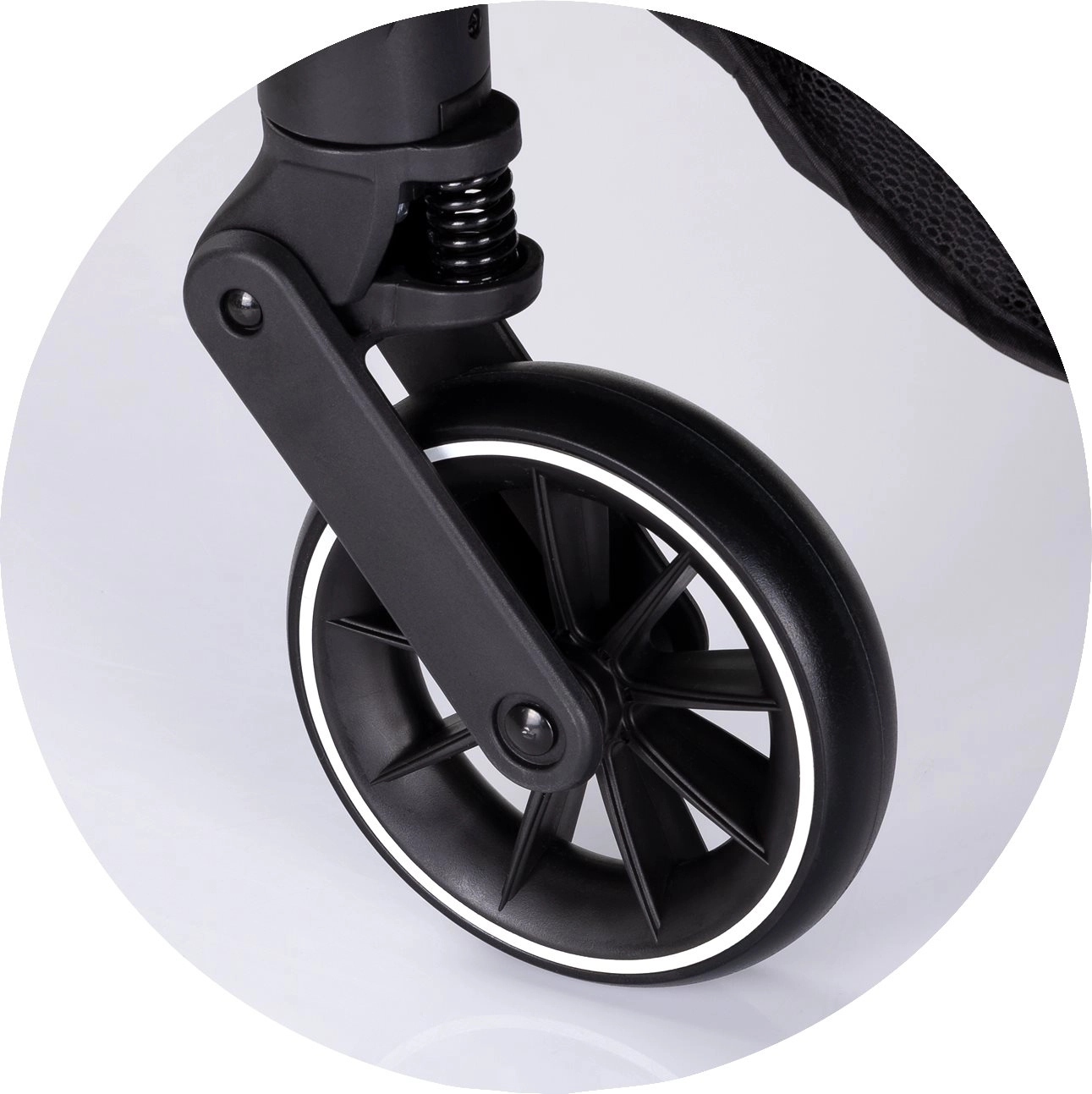 Bezpieczeństwo gwarantują pięciopunktowe pasy z miękkimi nakładkami oraz odpinane przednie pałąki z pokryciem z eko skóry. Amortyzowane, łatwo zdejmowane koła i tylny hamulec dbają o stabilną, płynną jazdę także w miejskim terenie. Praktyczne wyposażenie uzupełnia duży kosz na zakupy, ocieplacze na nóżki, uchwyt na napoje oraz torba z matą do przewijania, by szybko przewinąć dziecko w podróży.