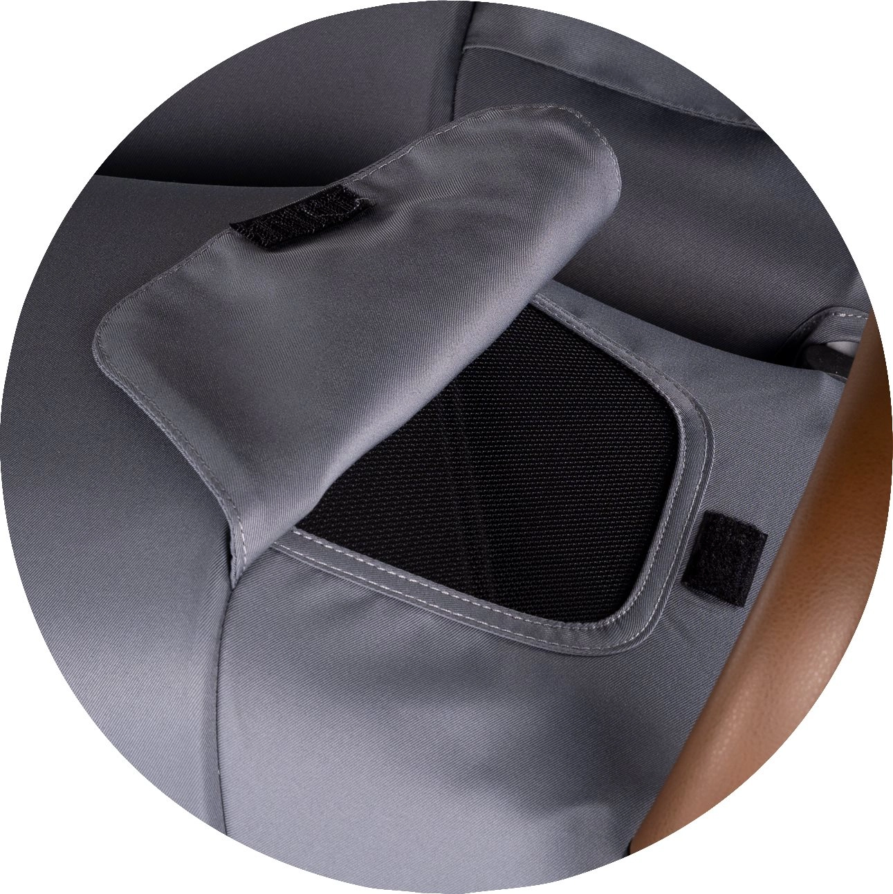 Niezależnie regulowane oparcia i podnóżki, pięciopunktowe pasy z miękkimi nakładkami oraz odpinane pałąki z eko skóry.