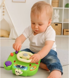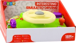 Dziecięcy symulator jazdy oferuje realistyczne efekty – po obróceniu kierownicy po panelu porusza się małe autko, a kierunkowskazy migają z dźwiękiem skrętu. Kolorowe przyciski odtwarzają 8 melodii MIDI oraz 7 zabawnych efektów dźwiękowych, klakson jest zawsze pod ręką, a dźwignia biegów aktywuje dźwięk przyspieszania i cofania. Aby oszczędzać energię, zabawka automatycznie usypia po 10 minutach bezczynności.