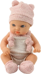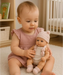 Ta urocza laleczka-niemowlę w beżowym body z różowymi akcentami wygląda jak prawdziwe maleństwo dzięki delikatnie modelowanym rysom twarzy i proporcjom. Miękki, przyjemny materiał i kompaktowy rozmiar 18 cm doskonale pasują do dziecięcych rączek.