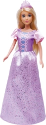 - długie blond włosy, błyszcząca fioletowo‑różowa suknia, bufiaste rękawki