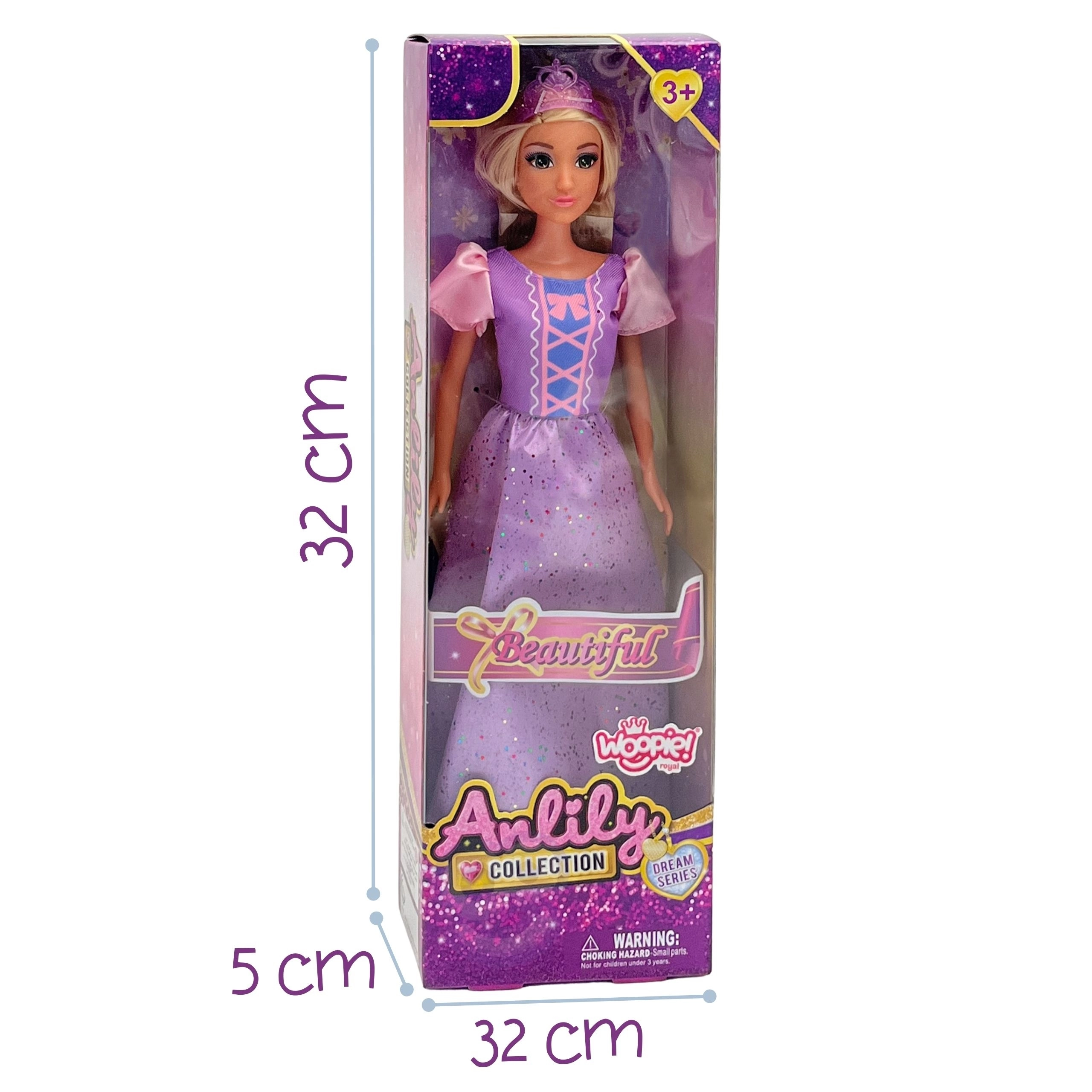 Magiczna lalka Lily marki Woopie zachwyci małe miłośniczki baśni. Ma długie blond włosy do czesania i stylizacji, nosi błyszczącą fioletowo-różową balową suknię z bufkami oraz przezroczystą fioletową tiarę. Wspiera wyobraźnię, odgrywanie ról i kreatywne opowieści. Odpowiednia dla dzieci od 3 lat.