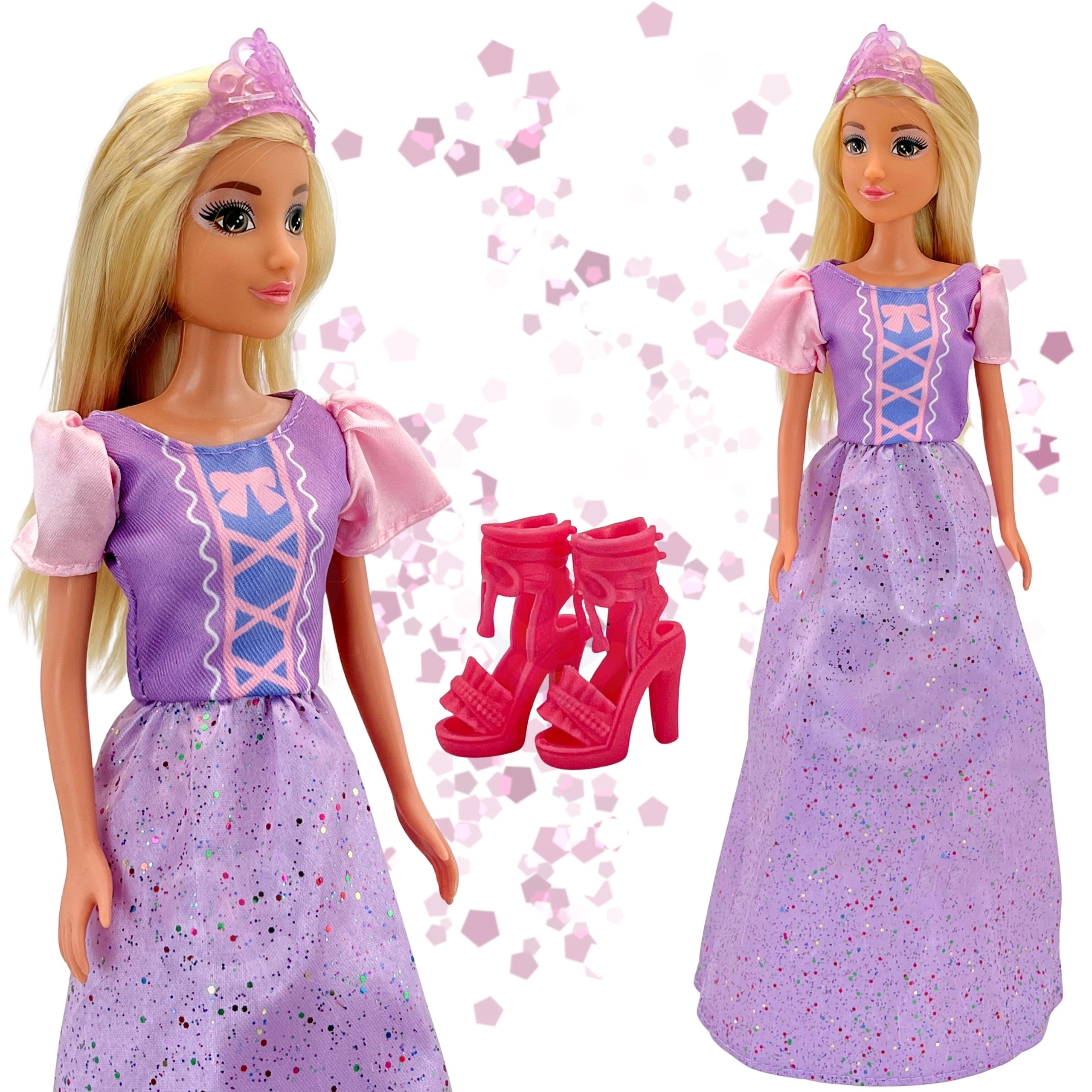 - Stylowe wyposażenie: błyszcząca fioletowo‑różowa suknia, ozdobny gorset, bufiaste rękawki i pasująca tiara.