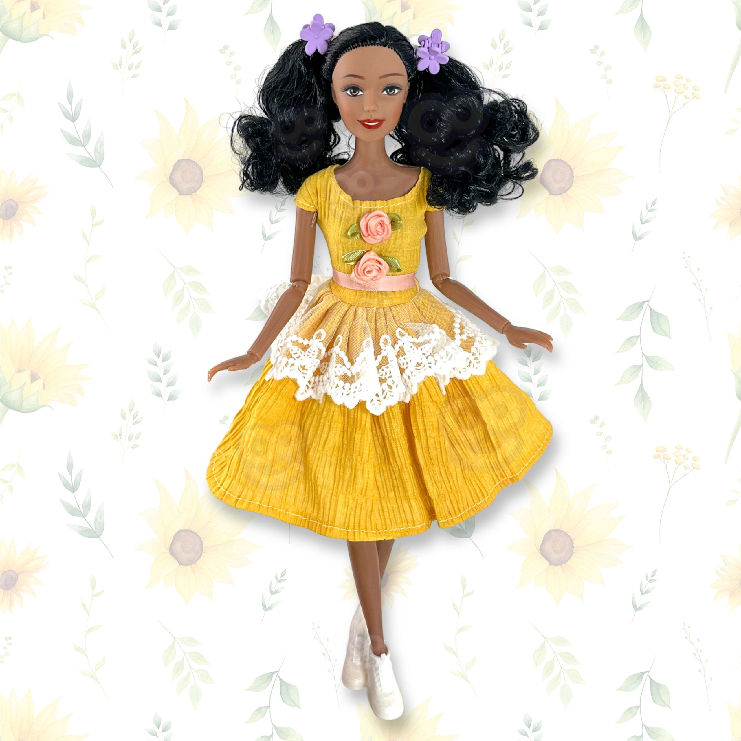 Odkryj elegancką lalkę Emi z kolekcji Woopie Royal, która zachwyca urokiem i precyzyjnym wykonaniem. Ma żółtą koronkową sukienkę z różyczkami, błyszczące buciki oraz długie czarne włosy ozdobione żółtymi dodatkami. Świetna do kreatywnej zabawy, rozwijania wyobraźni i jako idealny prezent dzięki eleganckiemu opakowaniu.