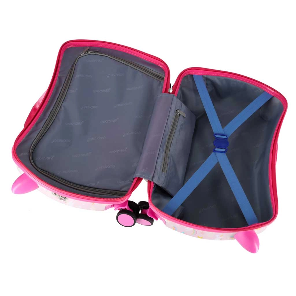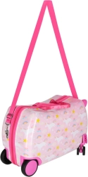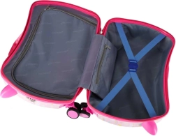 Konstrukcja walizki pozwala dziecku wygodnie usiąść i dać się ciągnąć za pomocą paska. Stabilne boki i podpórki na stopy zwiększają komfort i bezpieczeństwo.