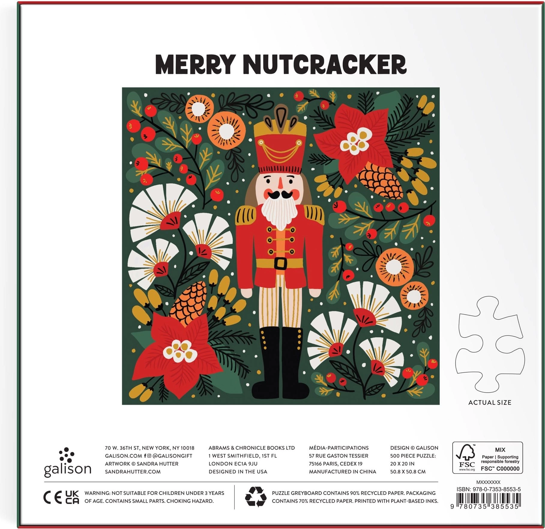 Odkryj urok świątecznego sezonu z motywem Wesołego Dziadka do Orzechów. Te metaliczne, kwadratowe puzzle zapewniają przyjemne wyzwanie i atrakcyjny połysk, który pięknie ożywia ilustrację. Dzięki formatowi 50,8 × 50,8 cm i 500 elementom świetnie sprawdzą się podczas zimowych wieczorów oraz jako wspólna zabawa z rodziną.