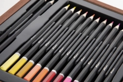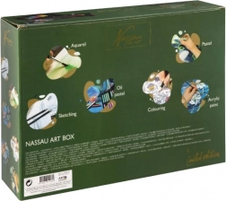 - Kompletne wyposażenie: 2 ołówki grafitowe, temperówka, gumka, 24 kredki, 24 woskowe kredki, 24 farby wodne, 10 farb akrylowych, 15 pasteli suchych, 2 pędzle.