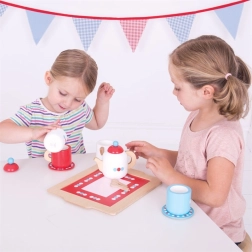 Zabawa w herbaciane przyjęcie rozwija komunikację, współpracę i wyobraźnię. Dzieci ćwiczą chwyt, precyzję i koordynację ruchów, tworząc własne historie i rytuały. Elegancki, kropkowany wzór w kolorach czerwonym, niebieskim i białym ożywi każdy dziecięcy kącik.