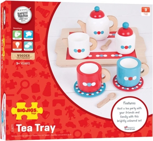 Wszystko, czego dzieci potrzebują do goszczenia: dzbanek, filiżanki ze spodeczkami, cukiernica, dzbanuszek na mleko, łyżeczki oraz stabilna taca ułatwiająca serwowanie.