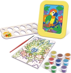 - 2 ponumerowane obrazki, kolorowy wzór, zestaw 9 farb ze stojakiem, plastikowa ramka do postawienia, pędzelek