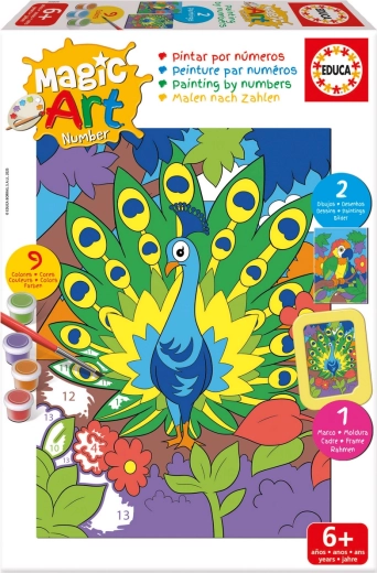 Zestaw Educa malowanie po numerach – paw i papuga pozwala krok po kroku wypełniać ponumerowane pola zgodnie z dołączonym wzorem. Każdy numer na płótnie odpowiada konkretnemu kolorowi, dzięki czemu efekt jest zawsze efektowny i pewnie wykonany.