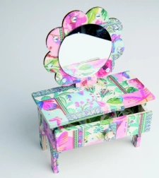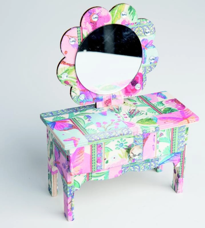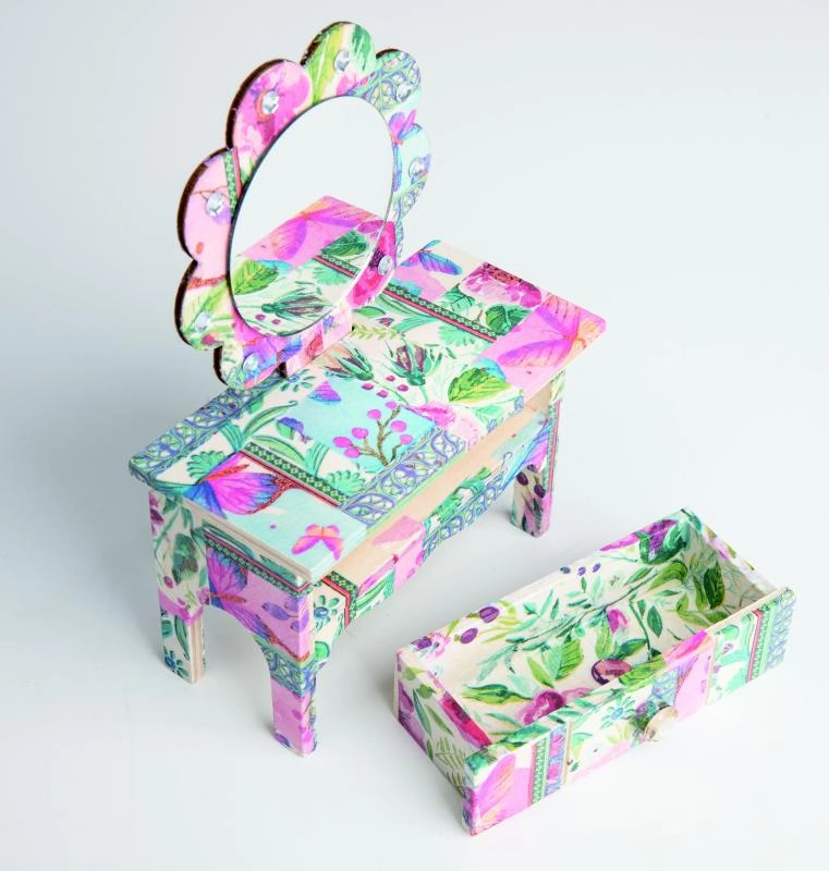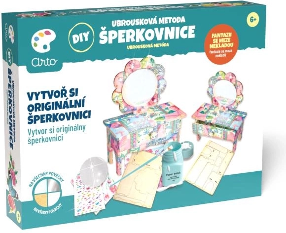 Złóż stylową szkatułkę w kształcie małej toaletki i ozdób ją popularną techniką decoupage. Zestaw ARTO oferuje prosty proces od montażu aż po końcową dekorację, dzięki czemu czeka Cię radość tworzenia i piękny efekt.