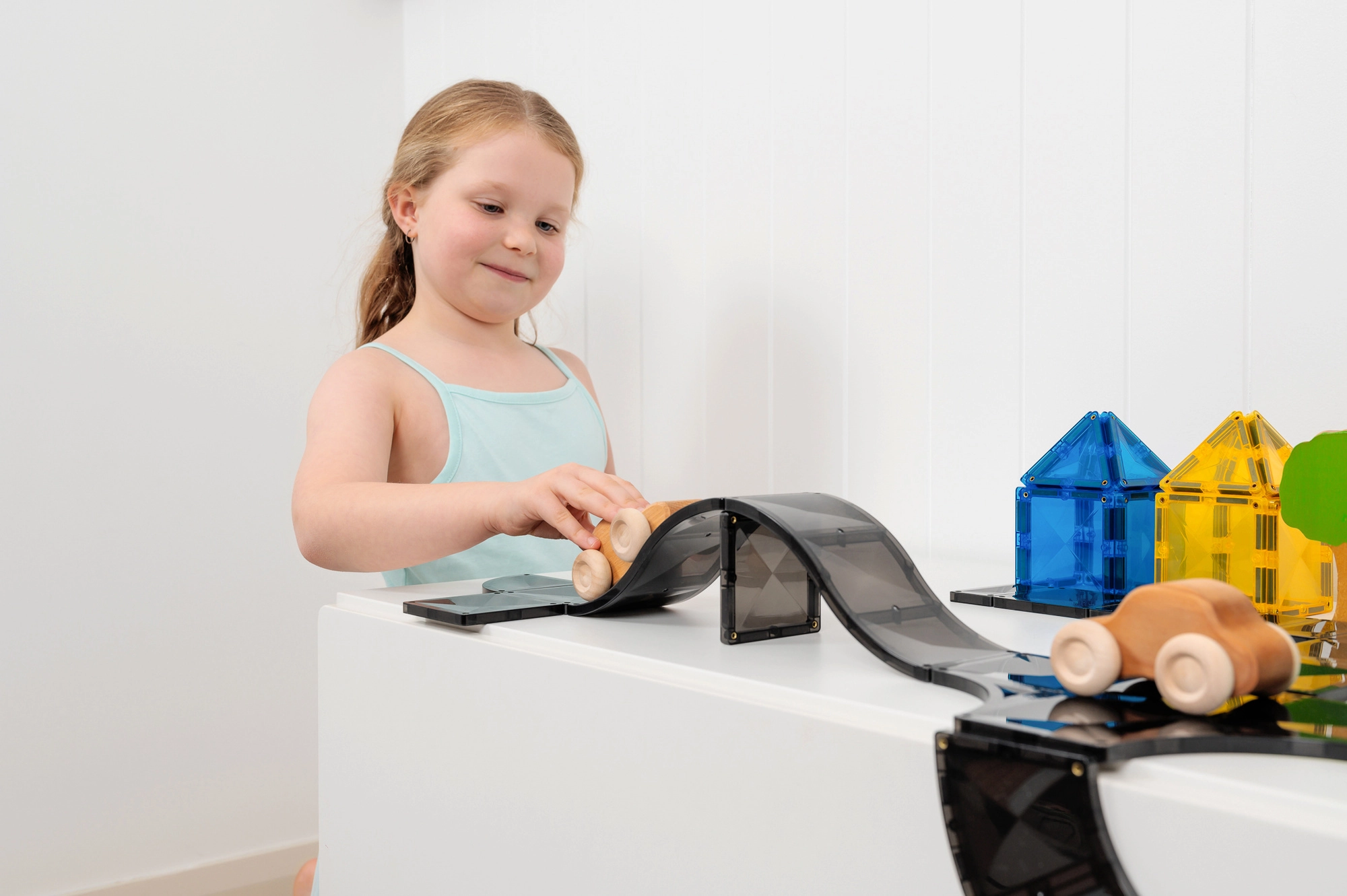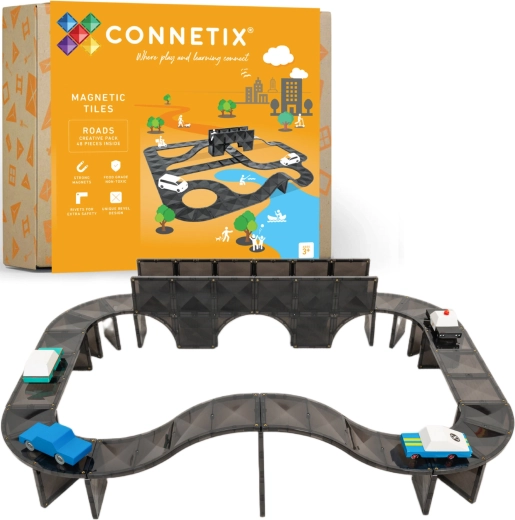 Zestaw Connetix Roads Creative Pack oferuje przezroczyste, solidne elementy dróg w eleganckim, ciemnym kolorze, które gładko łączą się dzięki mocnym magnesom neodymowym. Dzieci zbudują rampy, zakręty, skrzyżowania i mosty, po których mogą jeździć drewnianymi autkami. Podczas zabawy naturalnie trenują logiczne myślenie, motorykę oraz podstawy fizyki i geometrii.