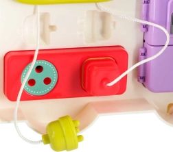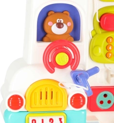 Otwierany autobus zamienia się w interaktywny panel z przyciskami, klapkami i okienkami. Dziecko bawi się i jednocześnie rozwija motorykę małą oraz spostrzegawczość.