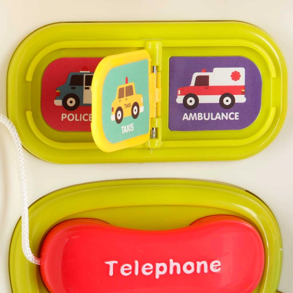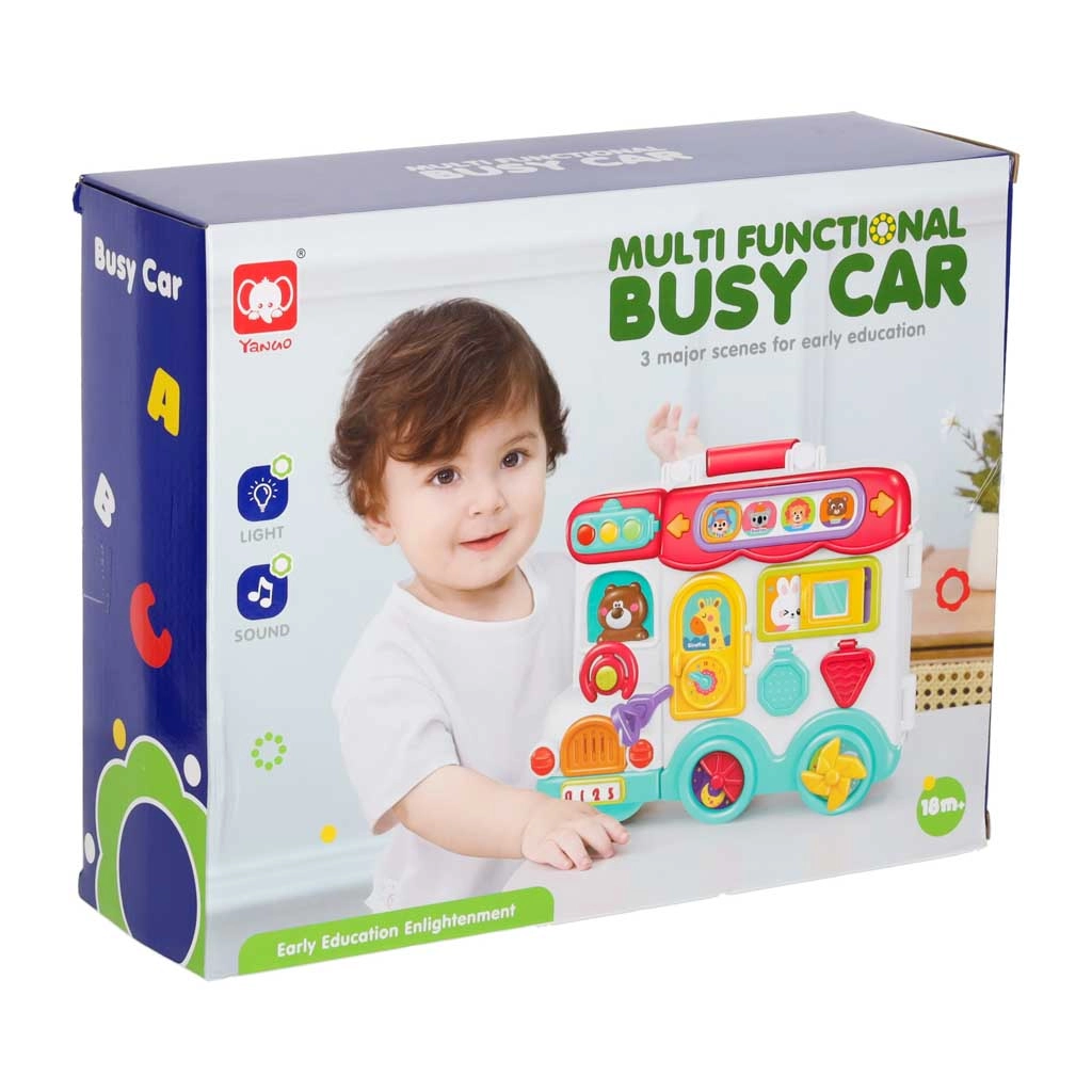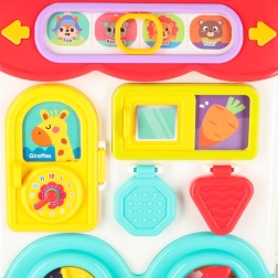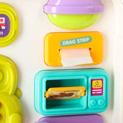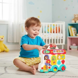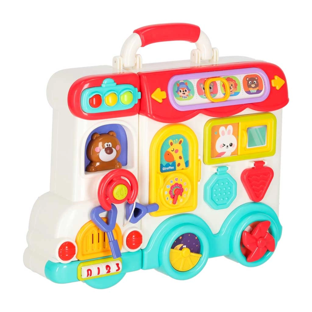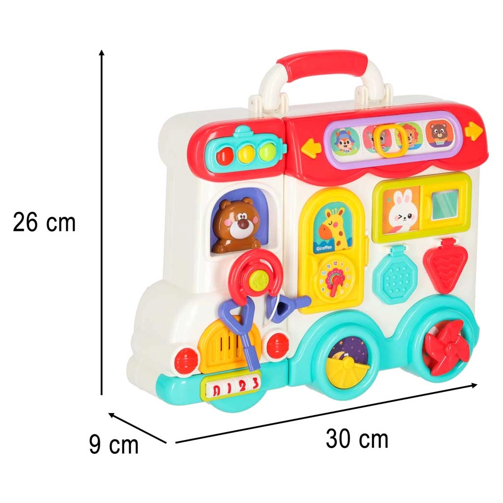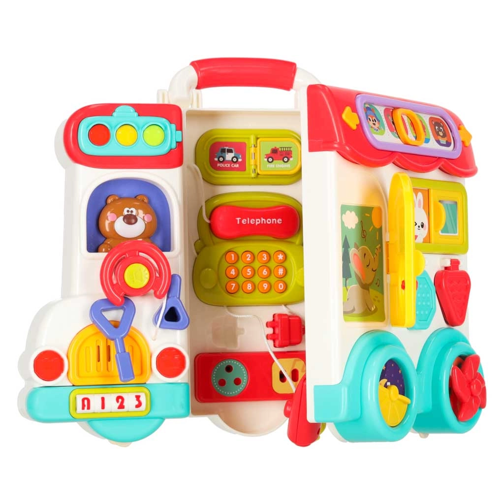 Ten interaktywny edukacyjny autobus w praktycznej formie kuferka to mobilne centrum odkrywania. Dzieci będą obracać kierownicą, naciskać klakson z efektem świetlnym, przesuwać okienka, odkrywać znaki drogowe, ustawiać wskazówki zegara i poznawać zwierzątka. Po przełożeniu na drugą stronę zamienia się w logiczny i sensoryczny panel z telefonem, mikrofalówką, „lodówką” ze światełkiem oraz treningiem właściwego dopasowywania.