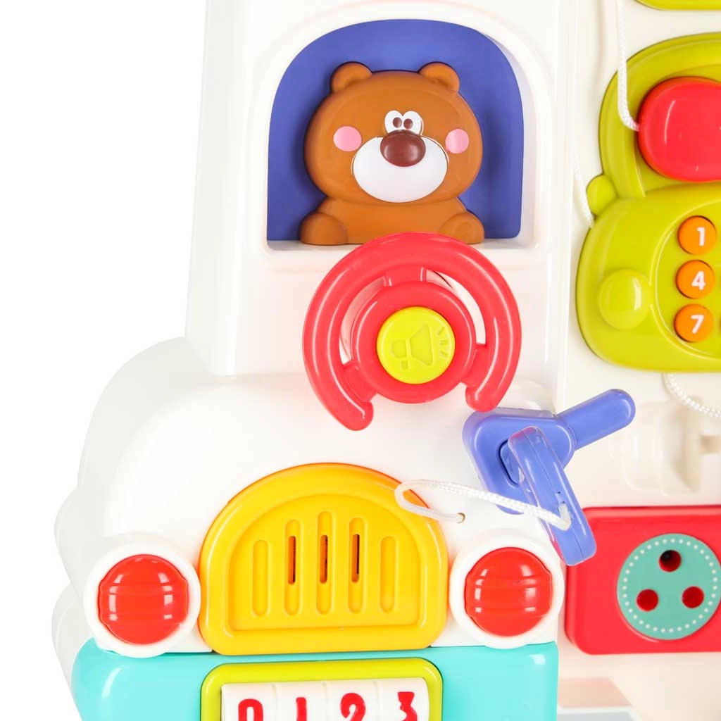 Klakson, przełączniki, pokrętła, telefon czy mikrofalówka. Dwa poziomy głośności oraz możliwość całkowitego wyciszenia dla spokojnej zabawy.