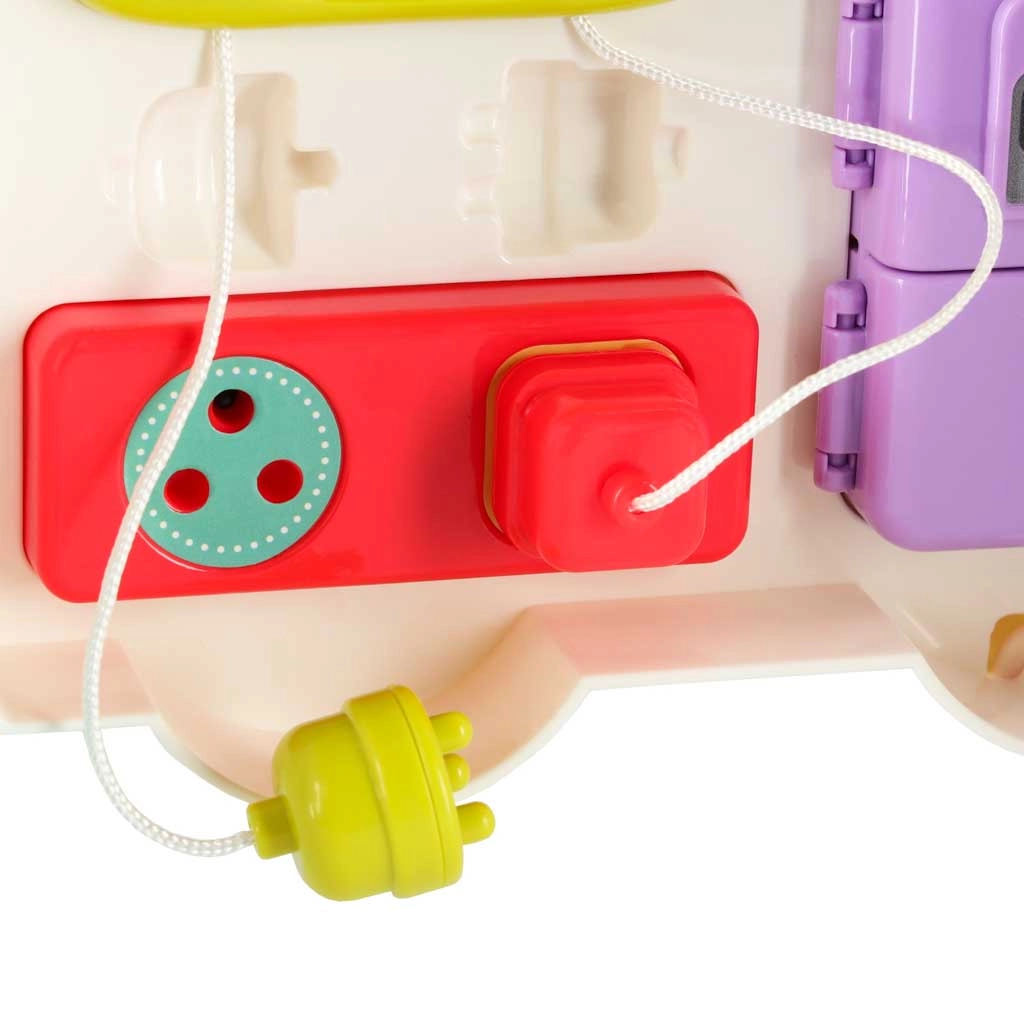 Trzecia część skupia się na codziennych umiejętnościach: dziecko poćwiczy sznurowanie, zapinanie paska, zapinanie guzika, manipulację akcesoriami, dbanie o „zęby” oraz obracanie dźwigniami z grzechoczącym efektem. Bogate bodźce sensoryczne rozwijają koncentrację, koordynację oko–ręka i samodzielność.