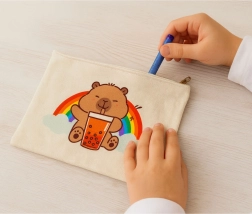 Urocza kosmetyczna saszetka z motywem kapibary pijącej bubble tea jest idealna do codziennego użytku. Jest lekka, kompaktowa i dzięki solidnemu zamkowi bezpiecznie przechowuje kosmetyki, przybory szkolne oraz drobiazgi. Wytrzymała tkanina i stylowy design sprawiają, że to etui to świetny dodatek do torebki, plecaka i w podróż.